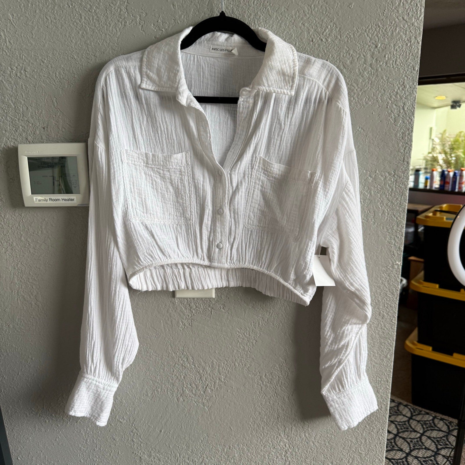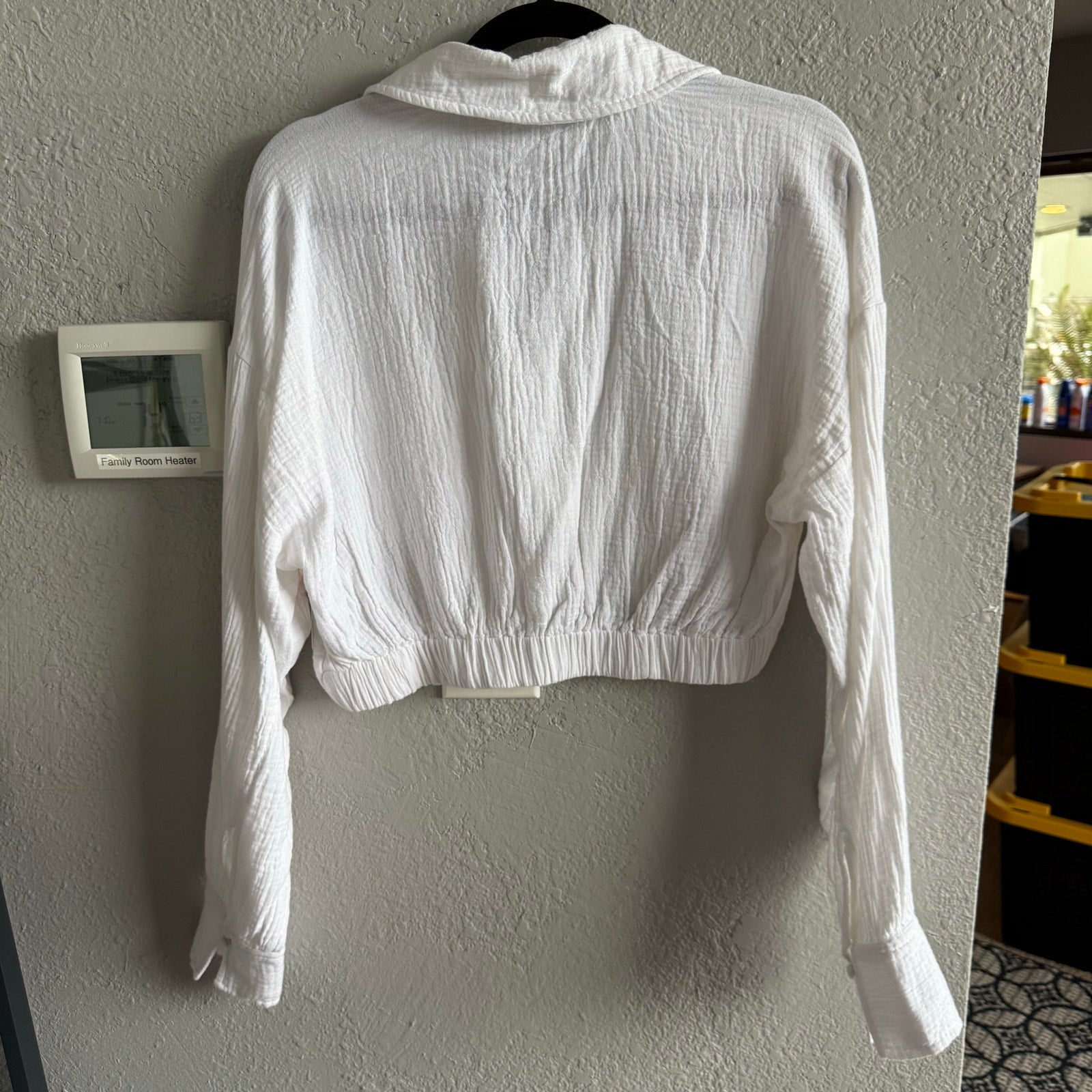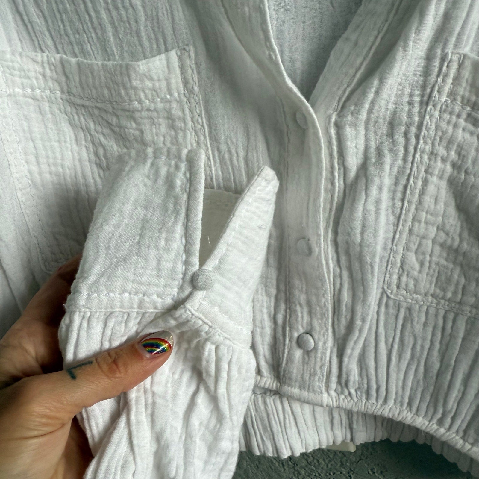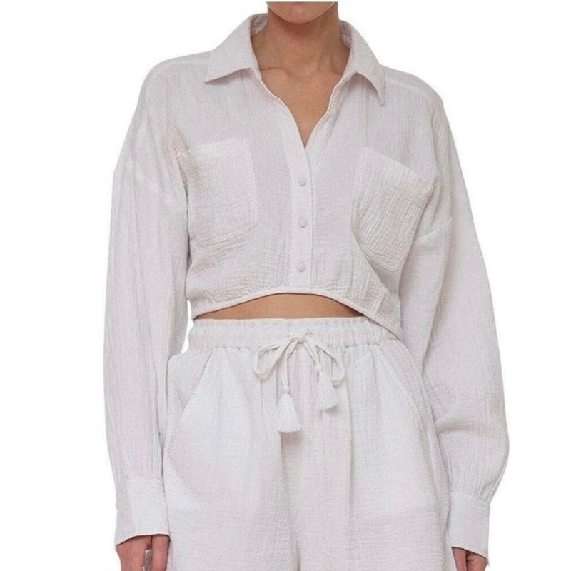 The specific item shown is a cropped, long-sleeved top made of a textured, likely gauze-like, material with a collared, button-down style and front pockets. 100% cotton. It was originally retailed at an MSRP of $129.