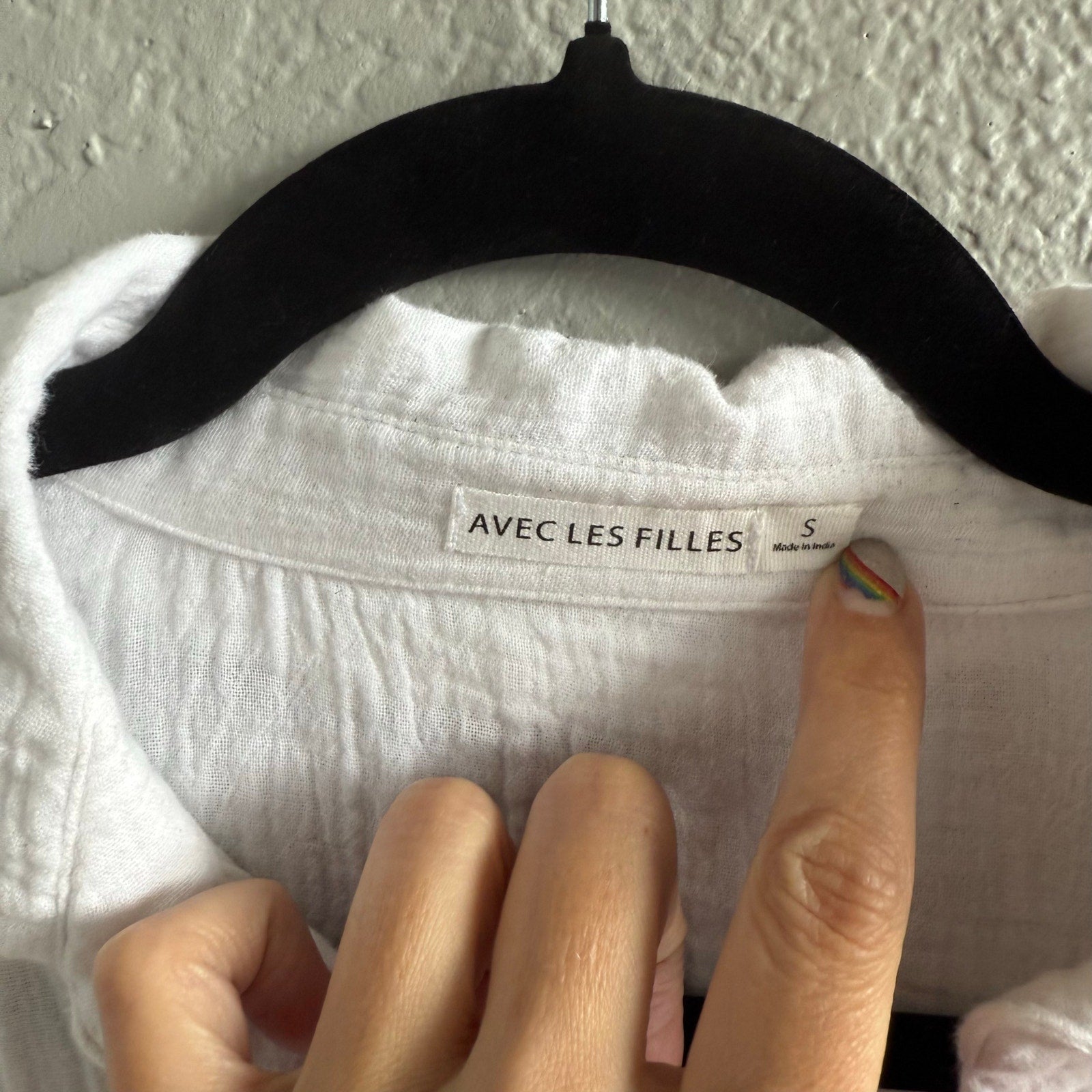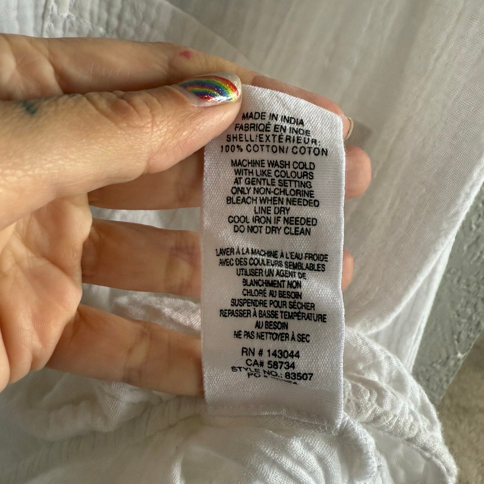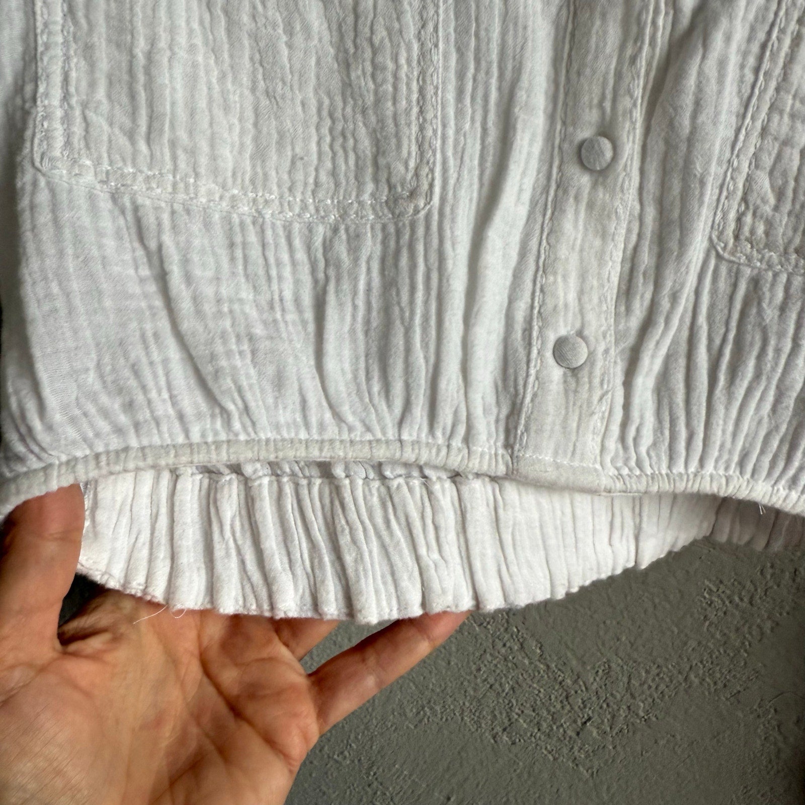 The specific item shown is a cropped, long-sleeved top made of a textured, likely gauze-like, material with a collared, button-down style and front pockets. 100% cotton. It was originally retailed at an MSRP of $129.