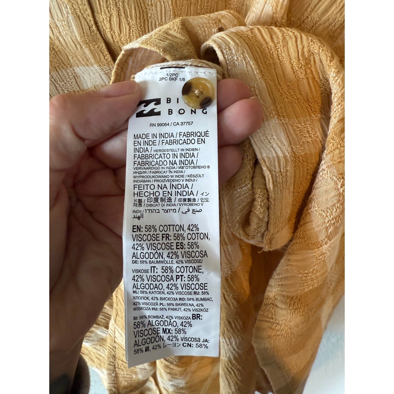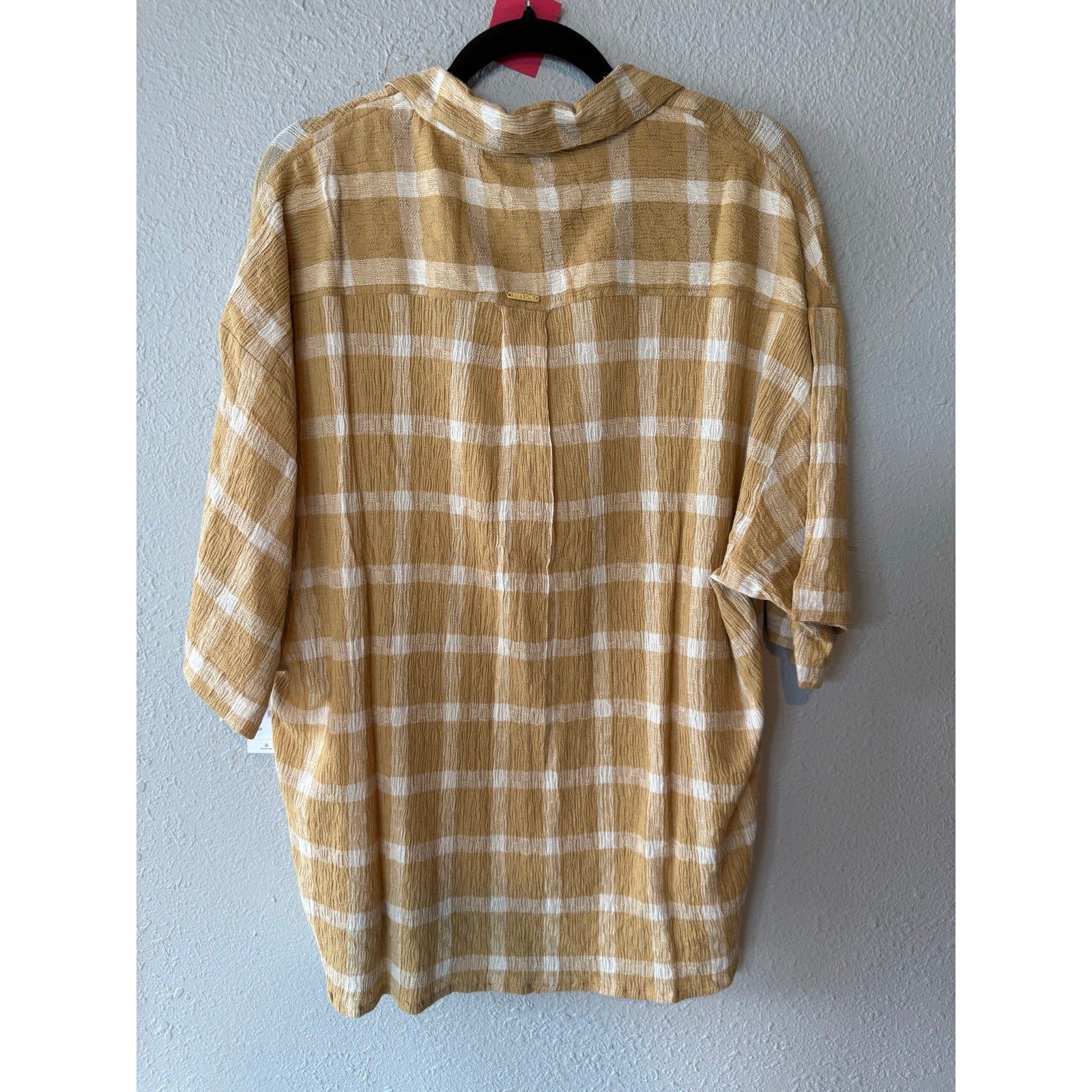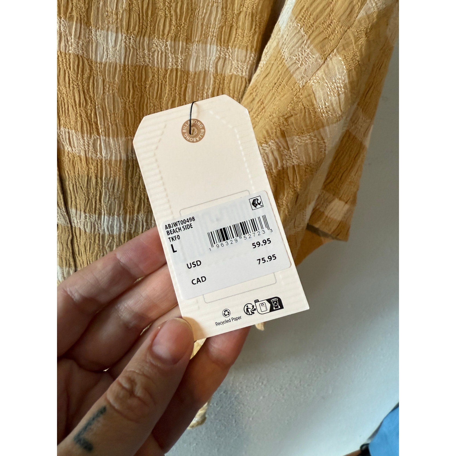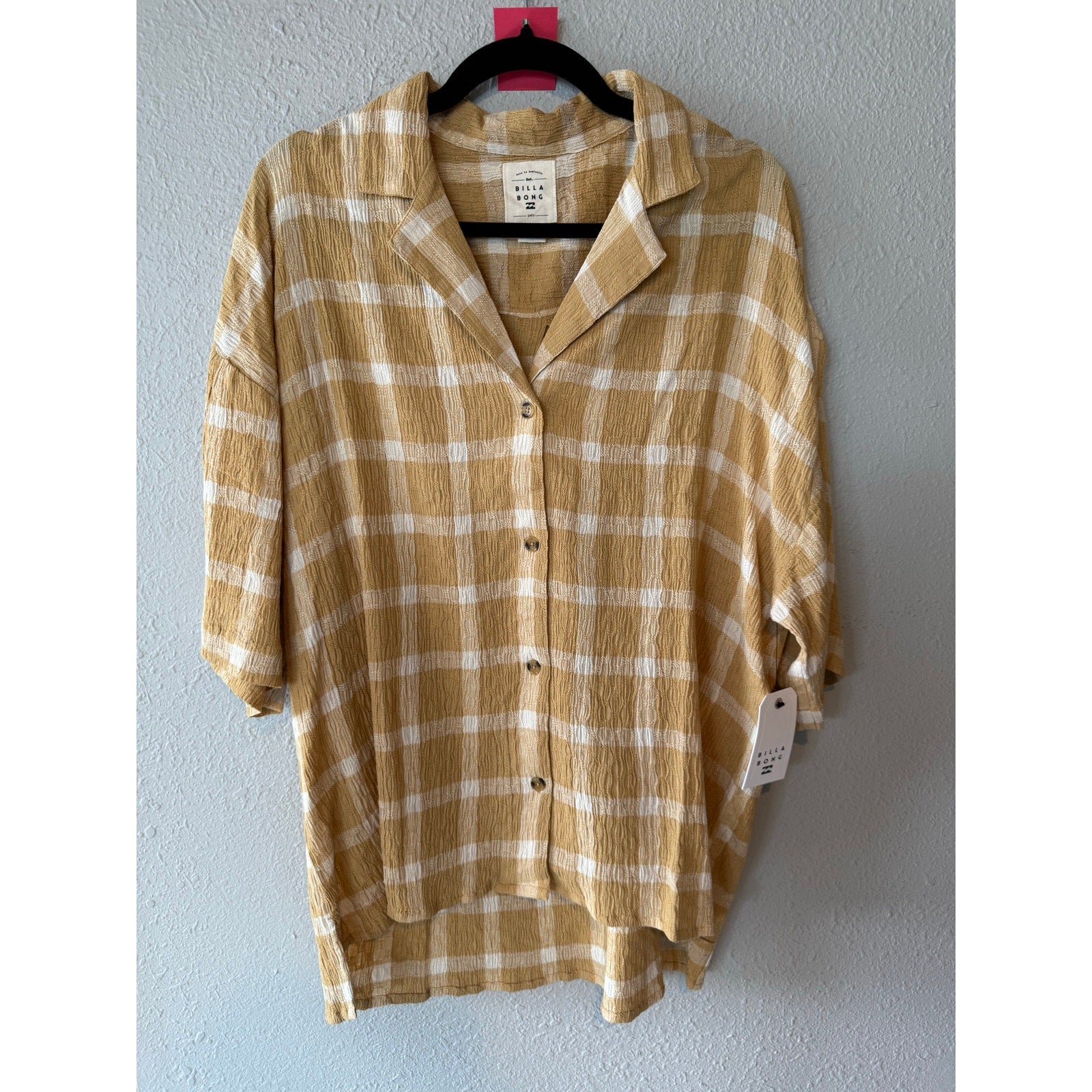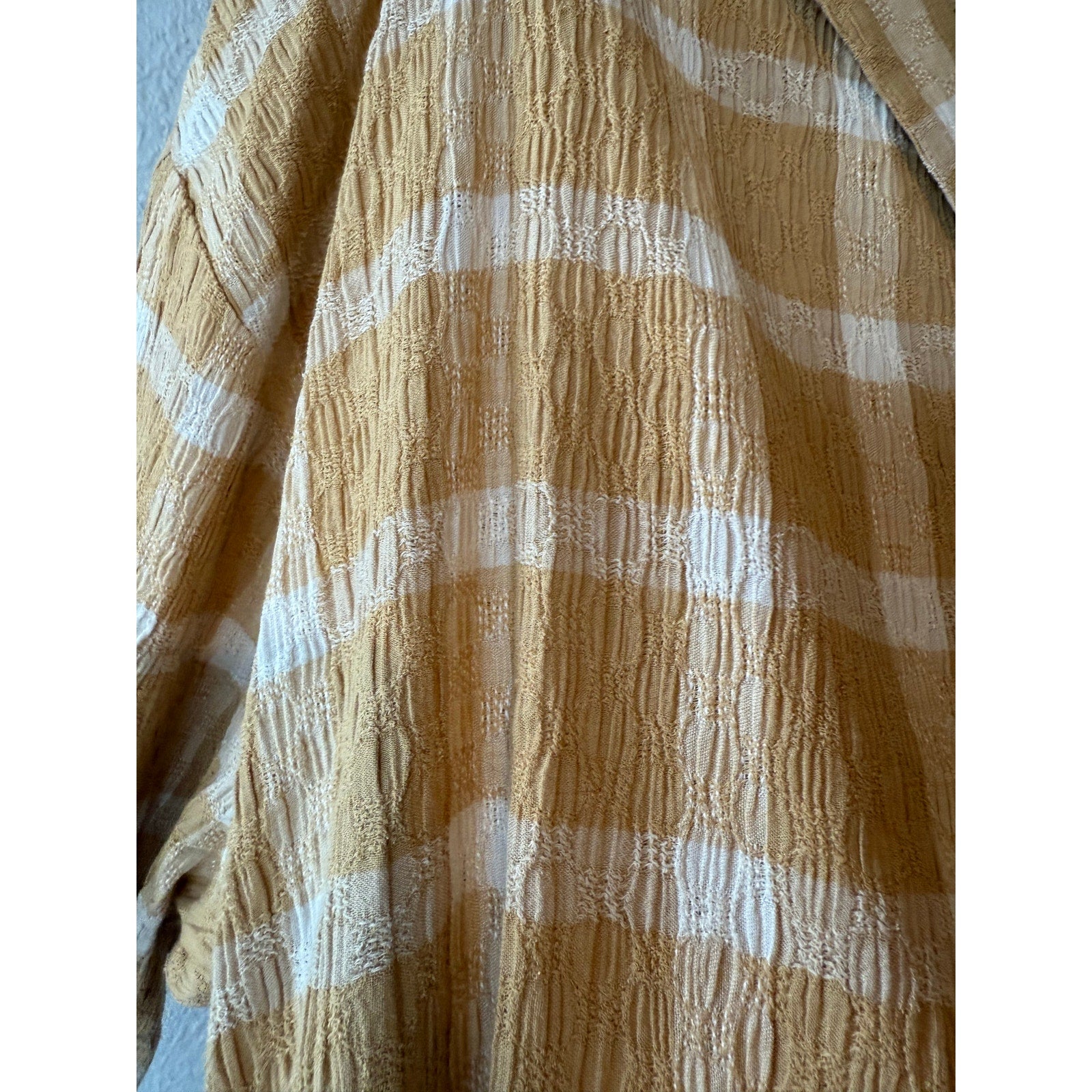 This is such a cute top! It’s a tan / mustard color, has an oversize fit, the fabric is cotton viscose blend yarn dye crinkle fabric. New with tags.