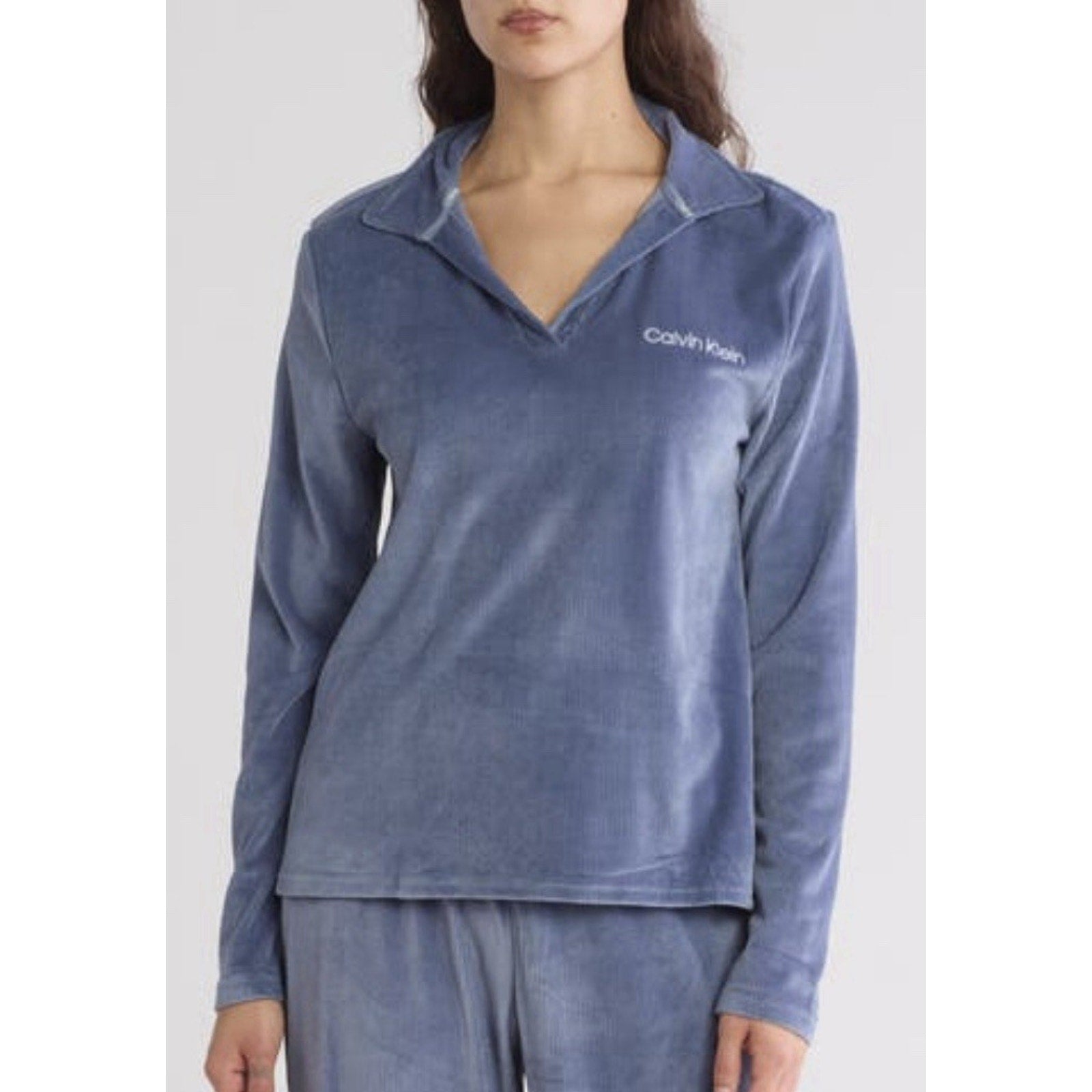 Experience comfort and style with the Calvin Klein Plush Rib Sleepwear Top, a must-have for your nighttime wardrobe. Designed for women who appreciate a blend of elegance and relaxation, this V-neck pajama top comes in a versatile blue hue that complements a variety of bottoms for mix and match versatility. Crafted in a medium size to ensure a regular fit, it embraces a cozy feel without compromising on fashion.