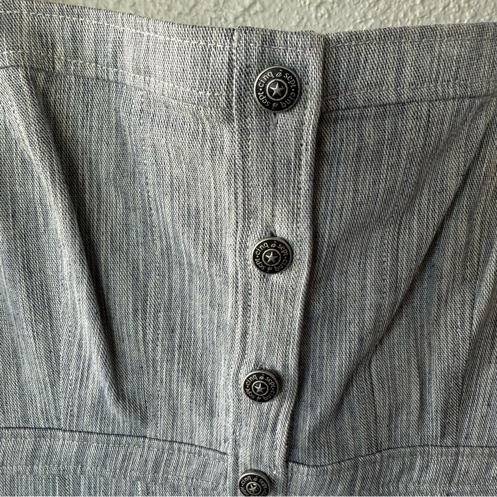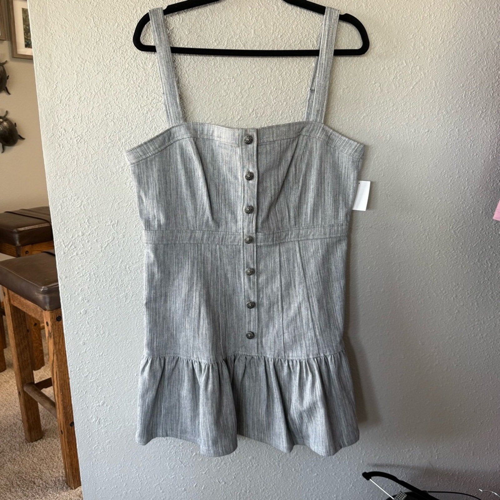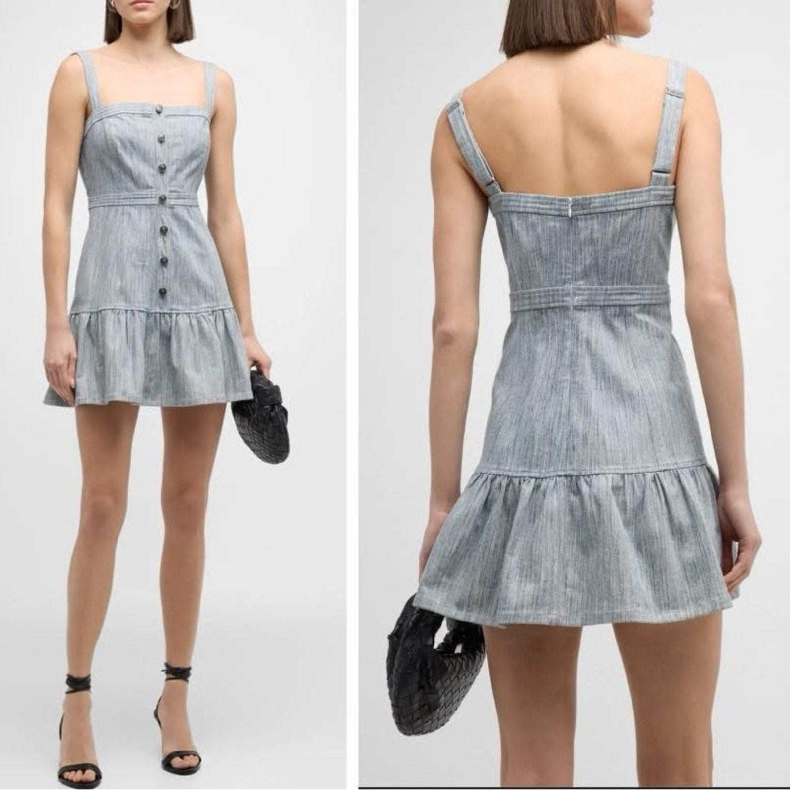Cinq à Sept's Mina sleeveless minidress boasts a denim-inspired space-dye design and square neck. This style is finished with logo-embossed buttons and a ruffled hem.