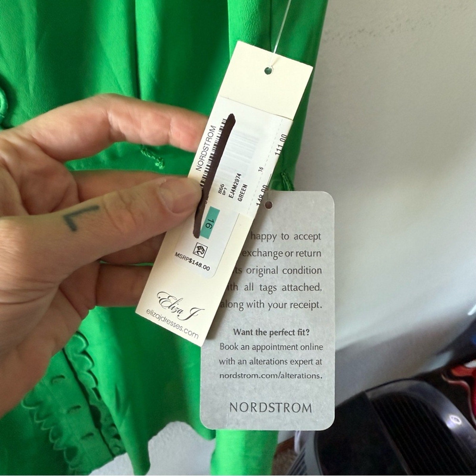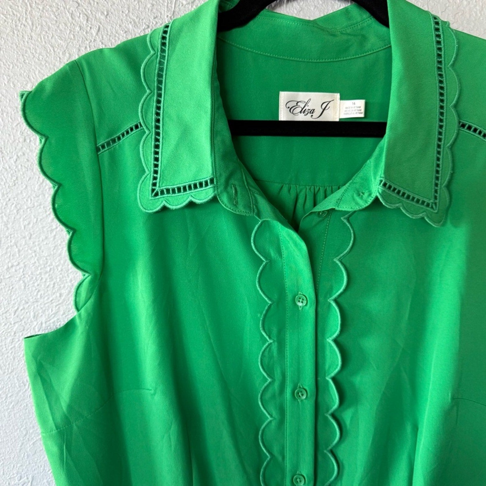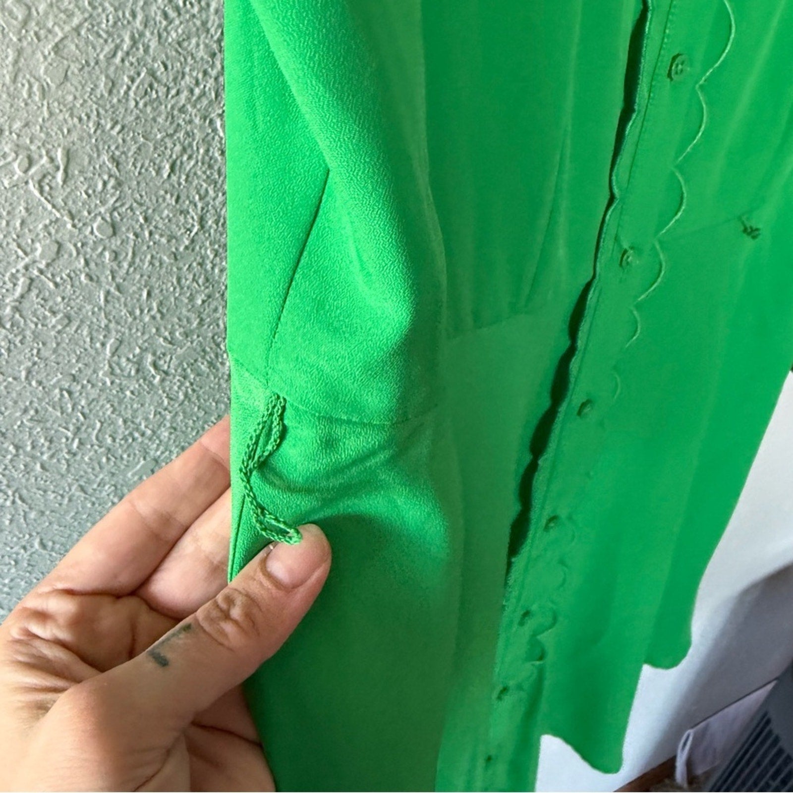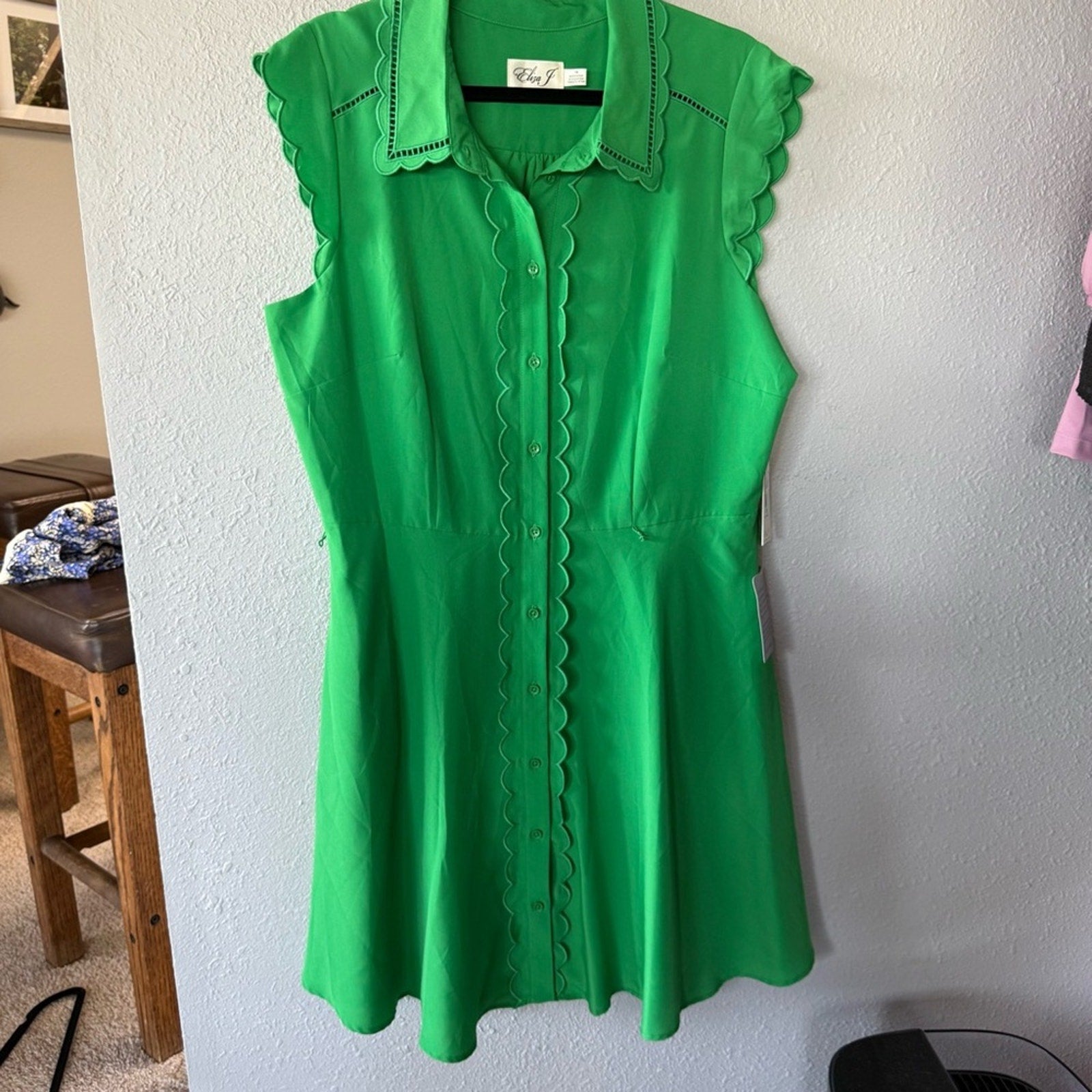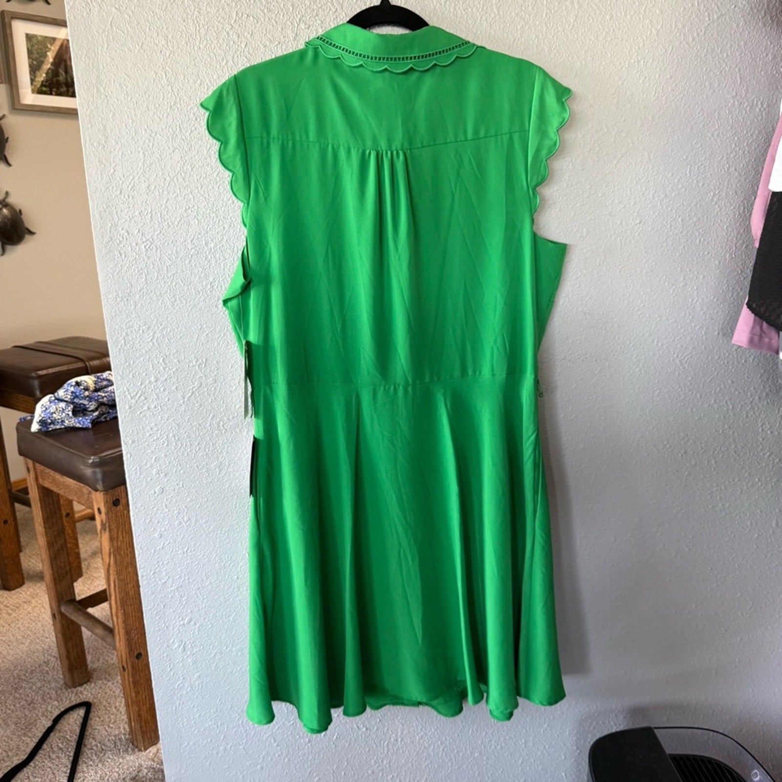 Chic green dress with scalloped edges and sleeveless design. Perfect for any occasion. The dress is new with tags but is missing the belt. It’s one of the cutest dresses I’ve seen!! MSRP $148