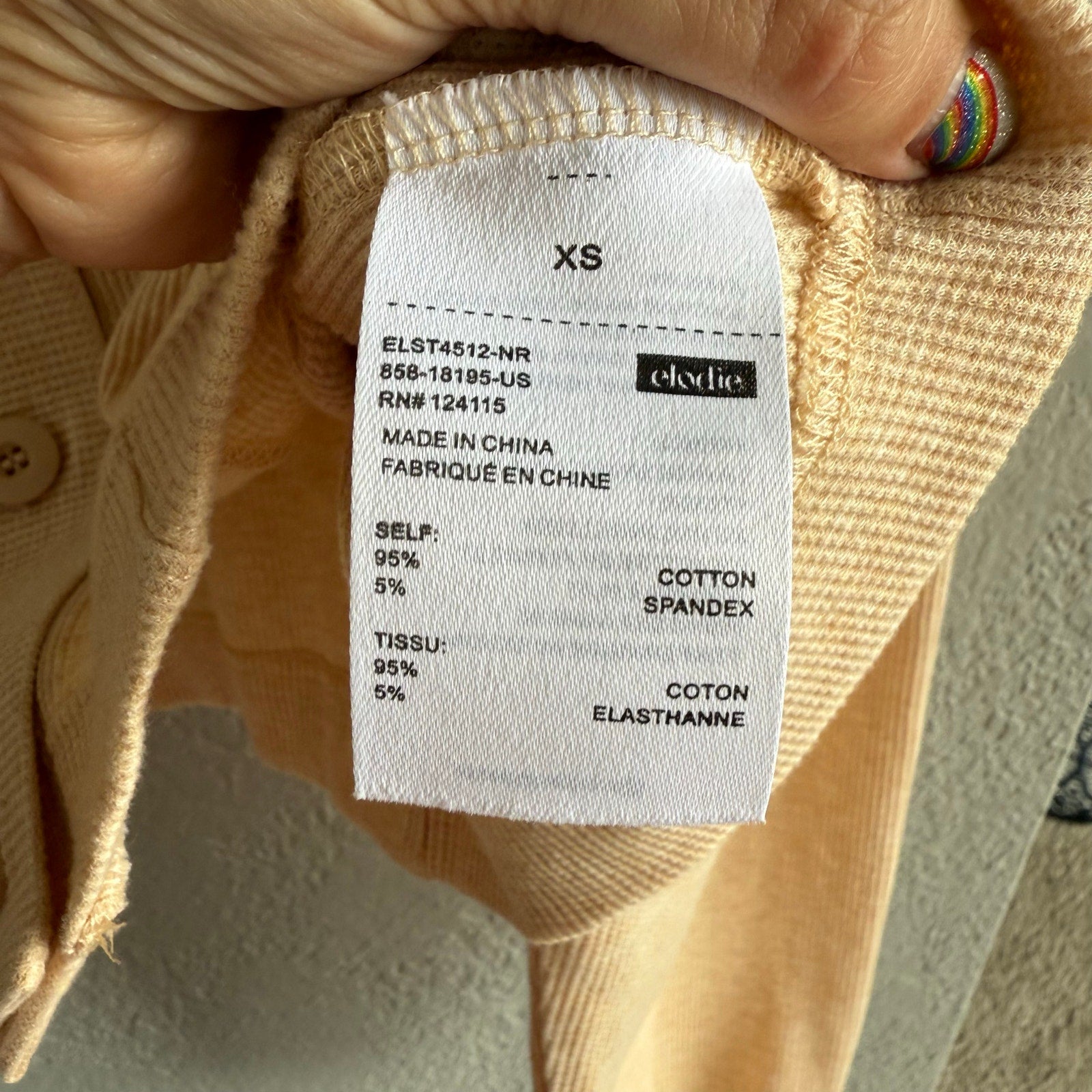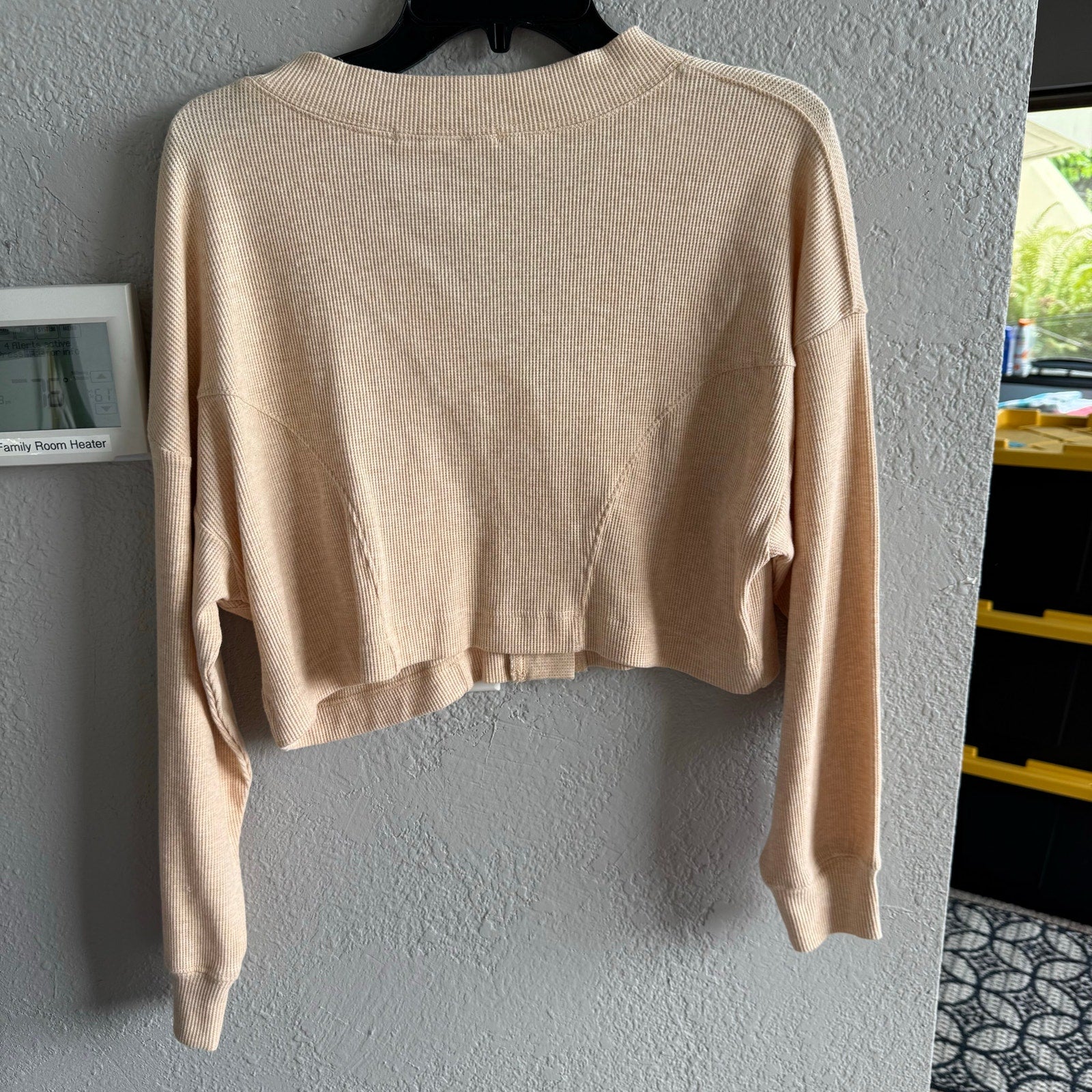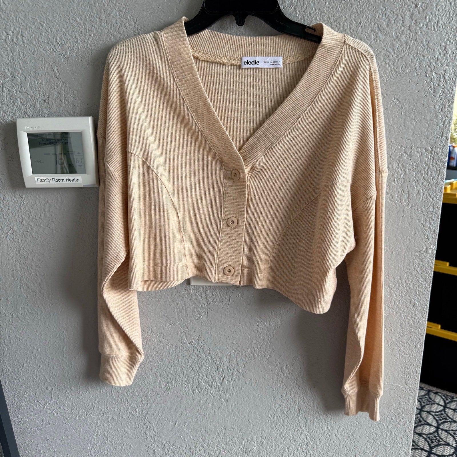 Peach / beige color, waffle knit material, button closure, crop cardigan type top. Elodie brand size XS