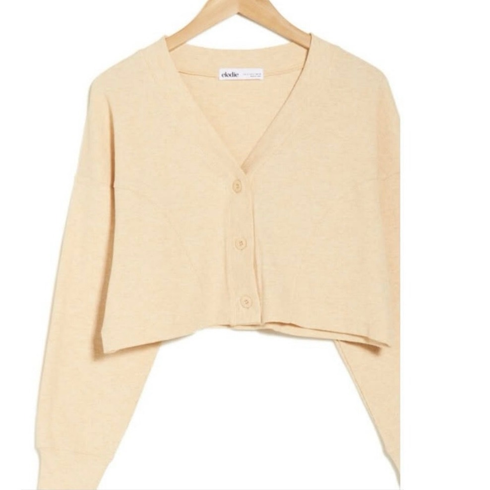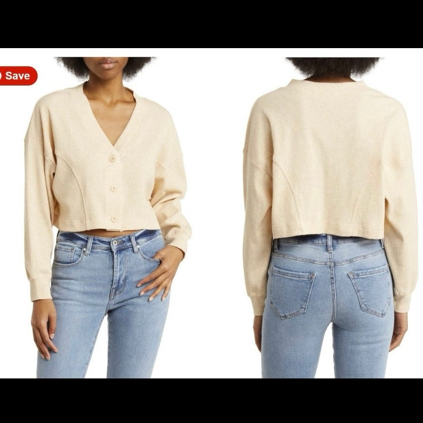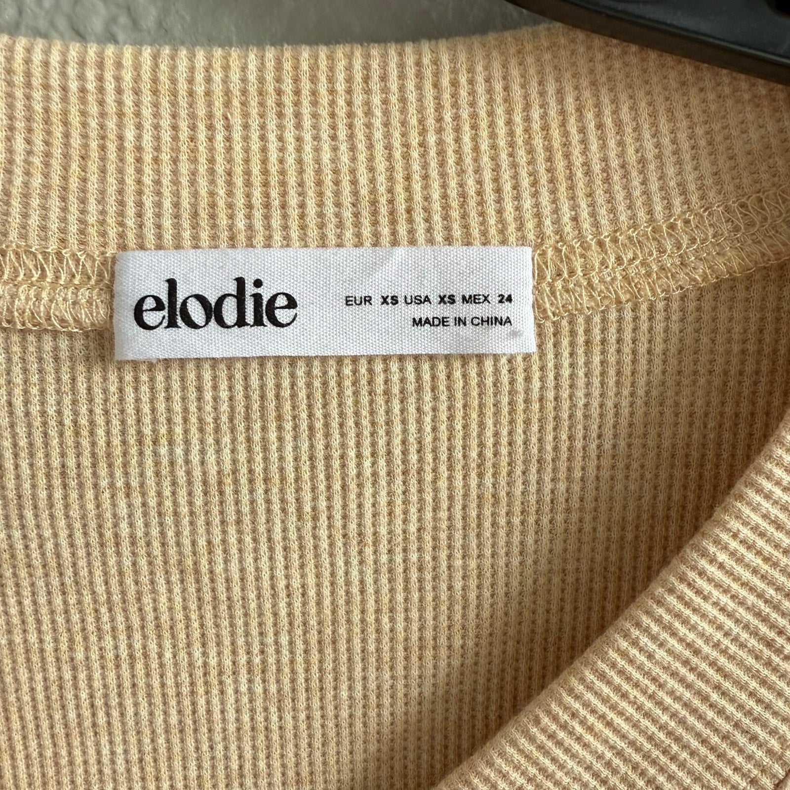 Peach / beige color, waffle knit material, button closure, crop cardigan type top. Elodie brand size XS