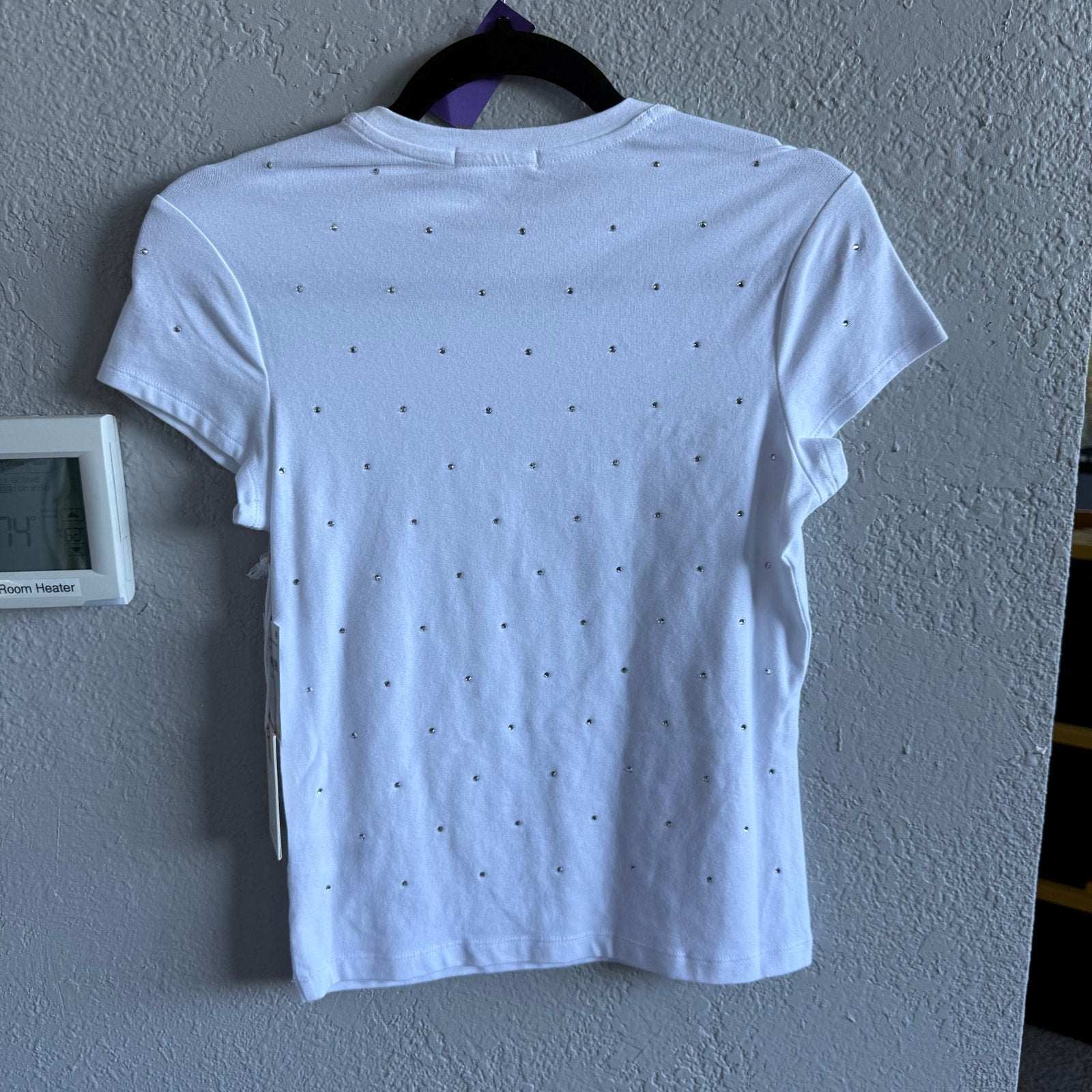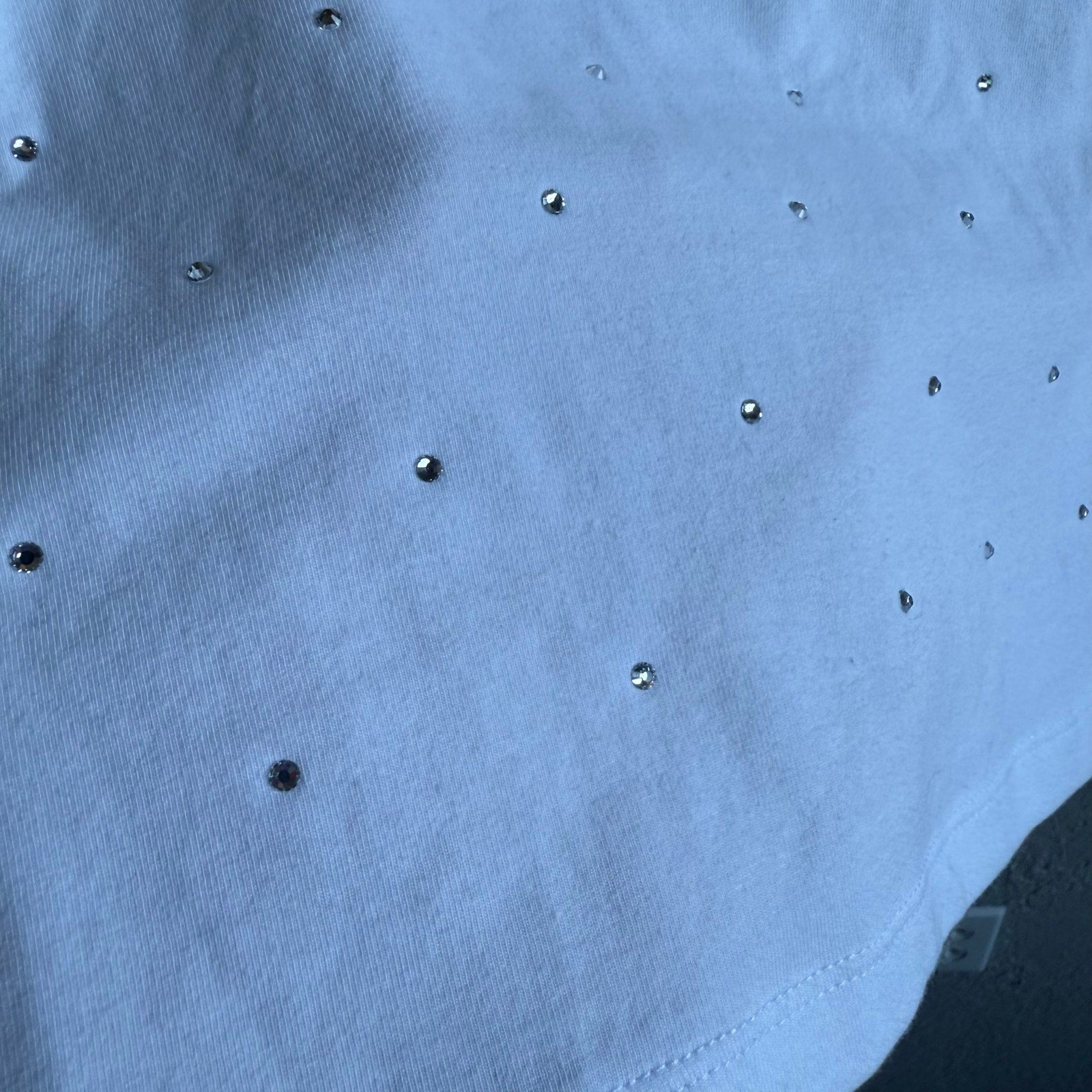 Super stretchy rhinestone baby tee top. New with tags but has a small smear of makeup on the collar from trying on. MSRP $89