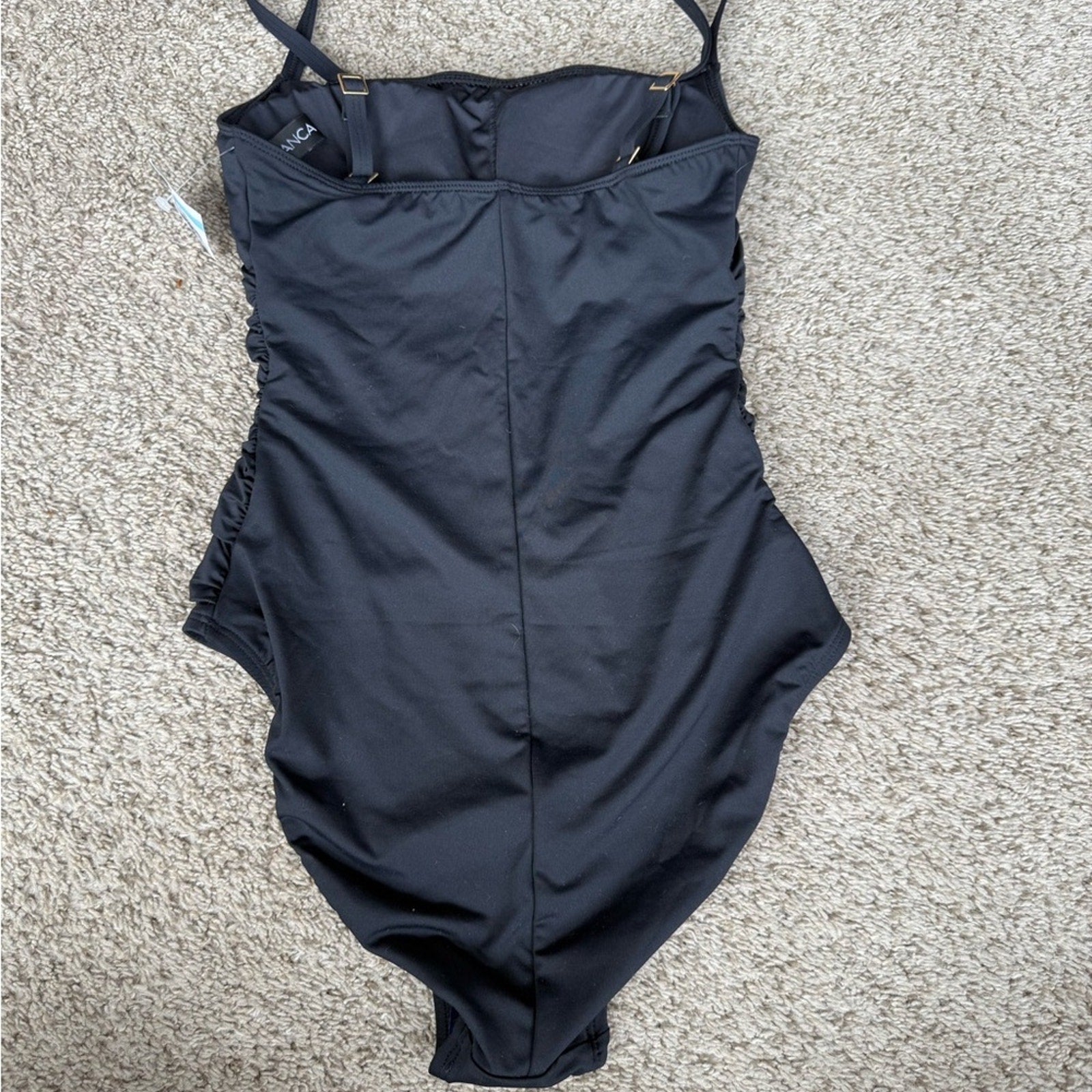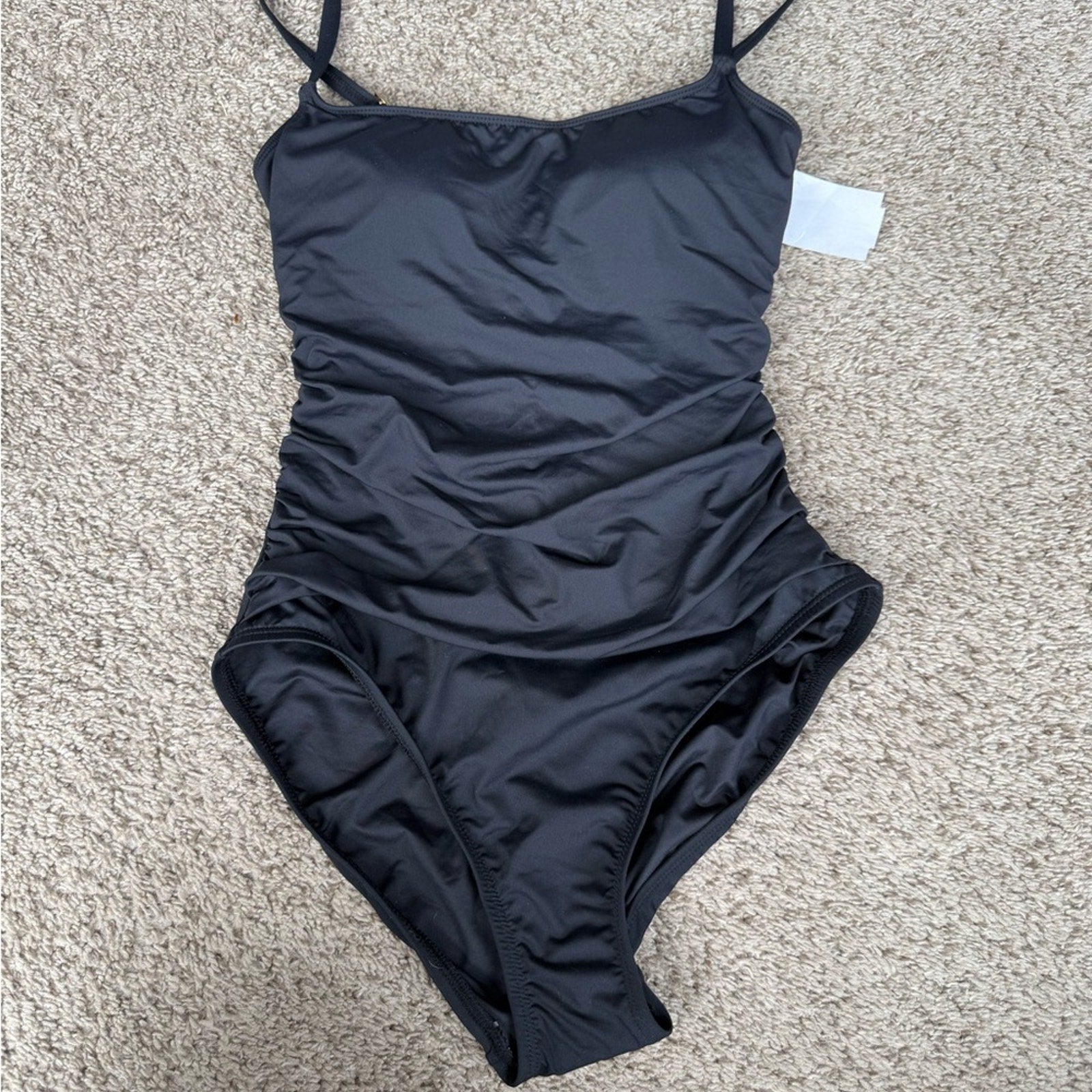 Elegant black one-piece swimsuit with thin straps. Perfect for a sleek beach look.