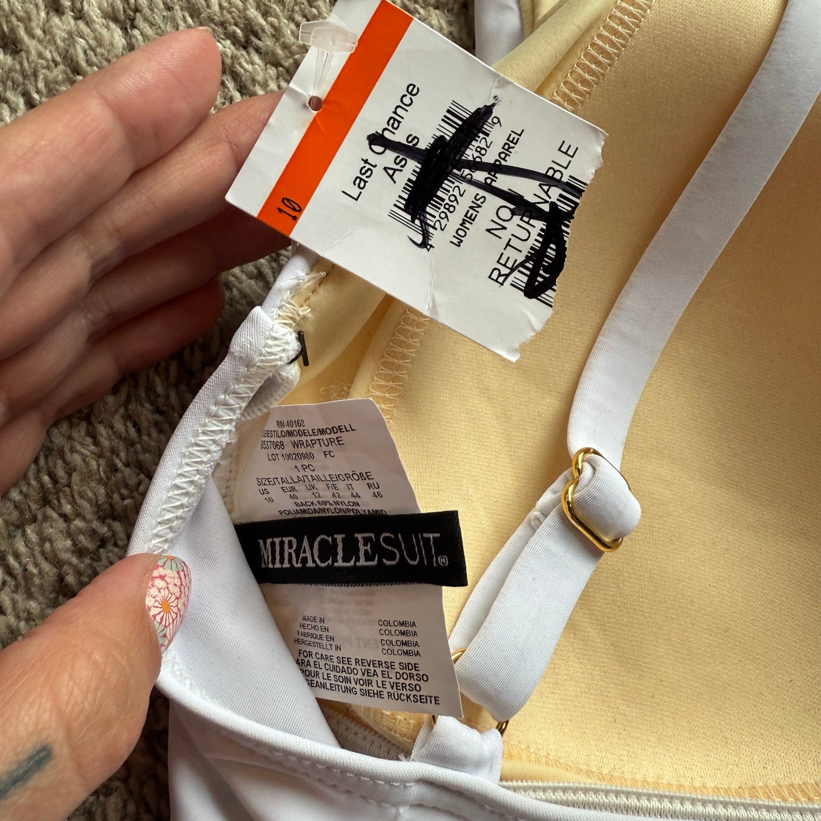 Miraclesuit halter one-piece swimsuit in white, size 10, featuring mesh details. Retail price $182. Condition: Brand new and unworn. Note that this suit is missing the original manufacturer’s tags and hygiene liner. Made from exclusive miratex® fabric, it contours the figure smoothly without the need for panels or linings. Designed with halter neck and adjustable shoulder straps, it showcases draped fabric, mesh inserts, and a flattering twist at the waist. Includes soft cups, hook-and-eye closure, and is composed of nylon and spandex for comfort and stretch.