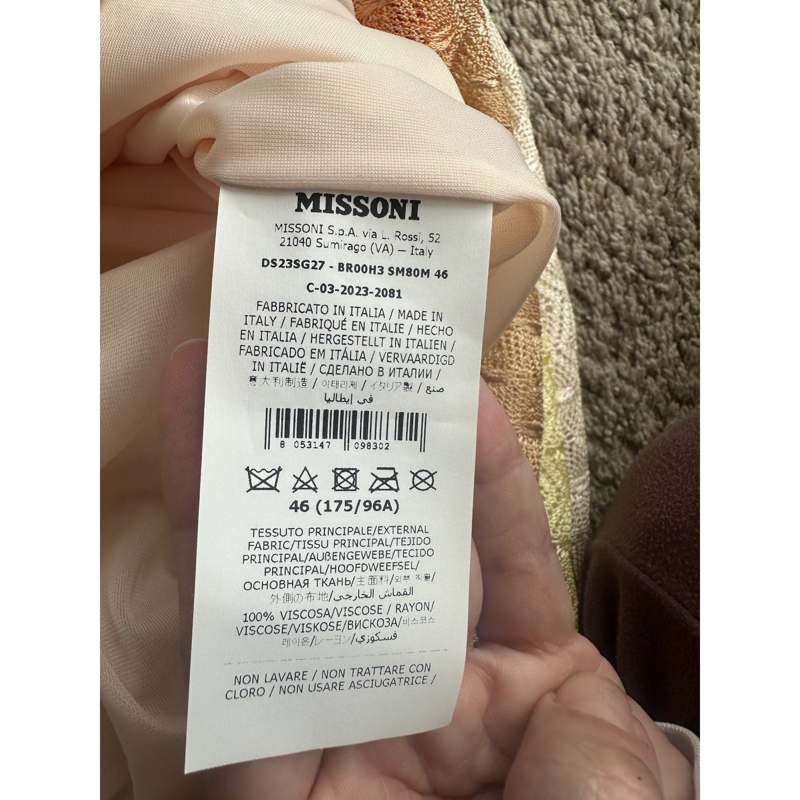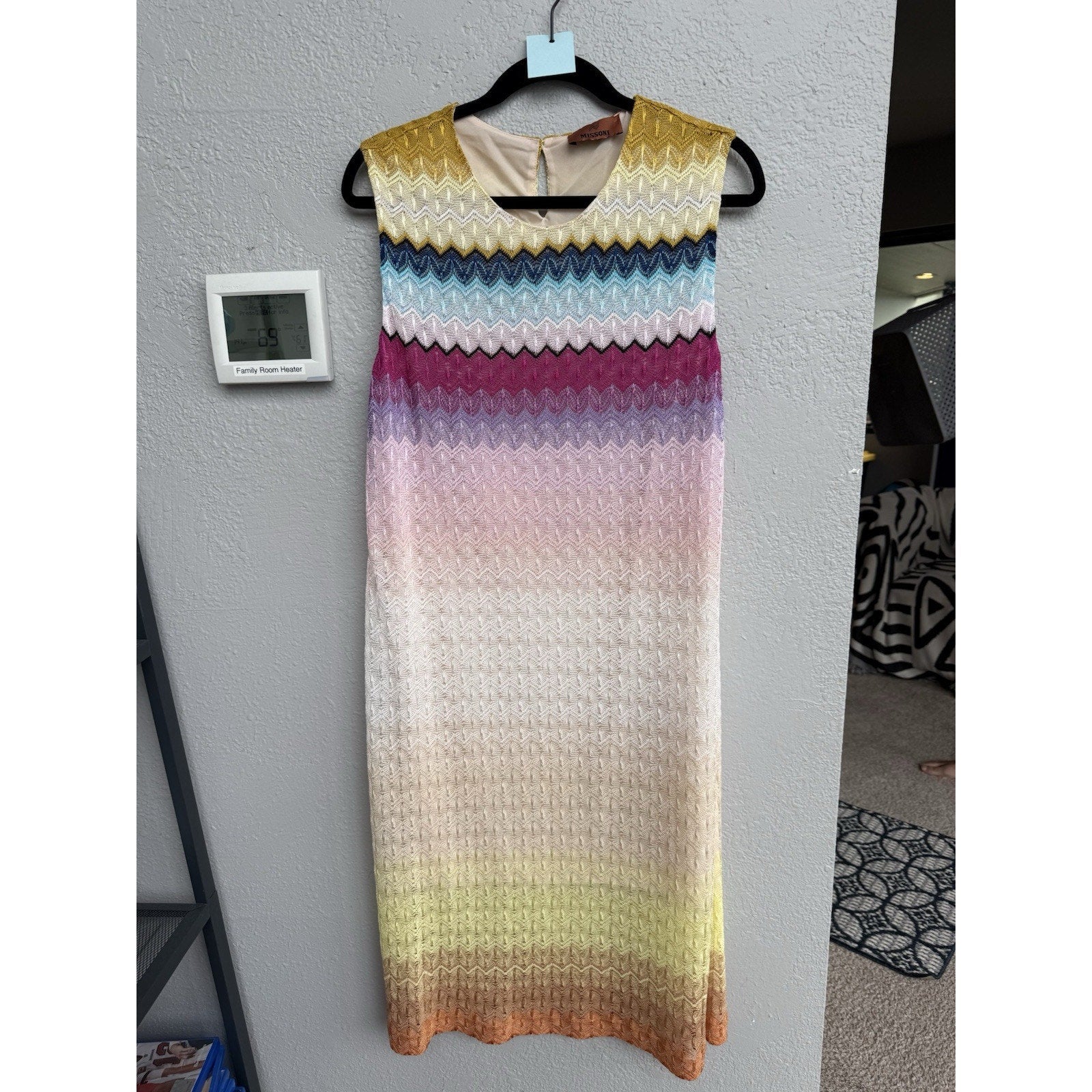 Dress to impress in this vibrant Missoni shift dress, a perfect blend of comfort and high-end fashion. The iconic Italian brand is renowned for its luxurious knit fabrics, and this dress is no exception, crafted from soft, breathable viscose for a delightful feel. The sleeveless design and round neckline make it an ideal choice for both casual outings and sophisticated cocktail events. Available in a size 10 and designed to flatter with its midi length, this multicolor piece showcases Missoni's signature pattern that effortlessly transitions from day to night. Proudly made in Italy, it's a versatile addition to your wardrobe that exudes the essence of the brand's storied heritage and timeless appeal.