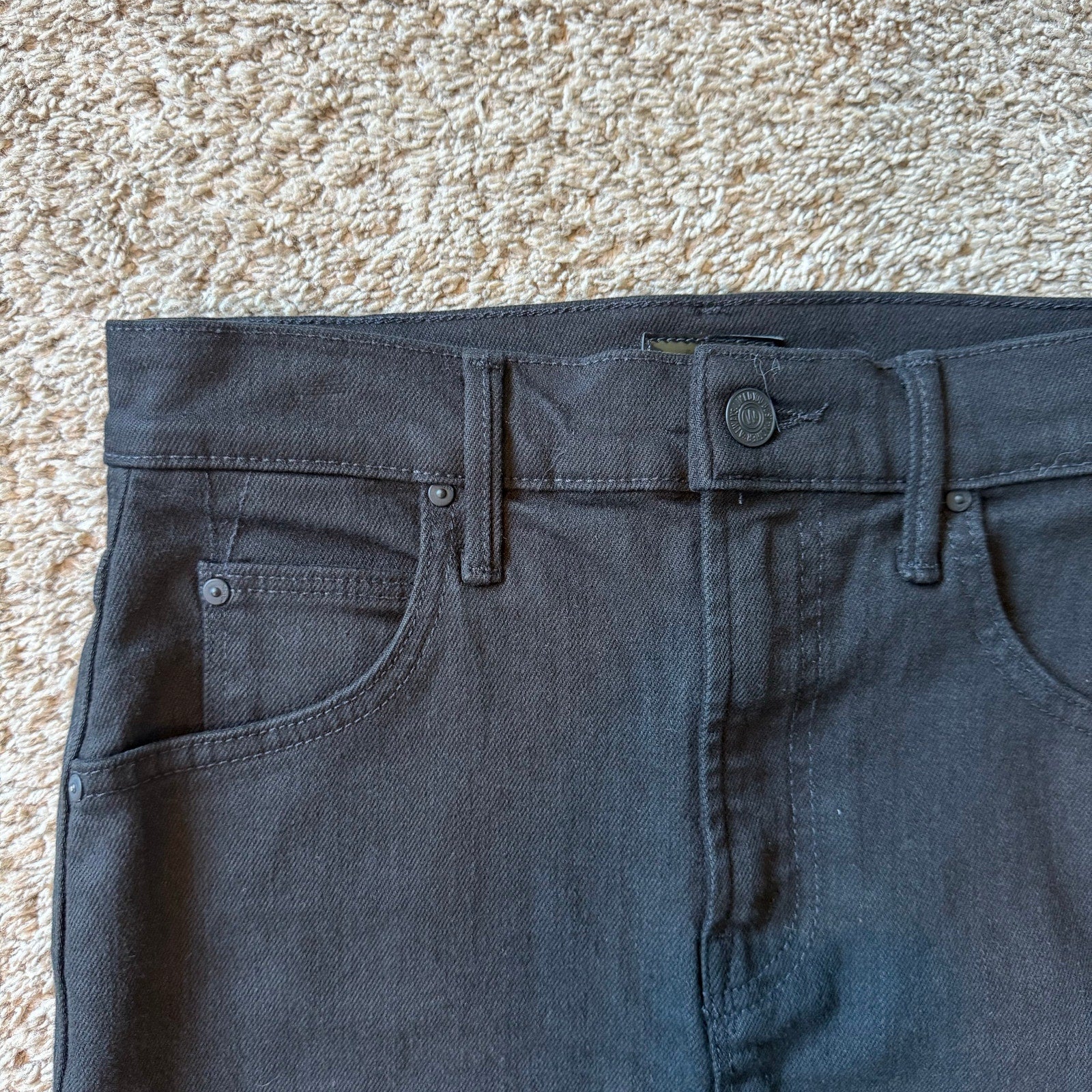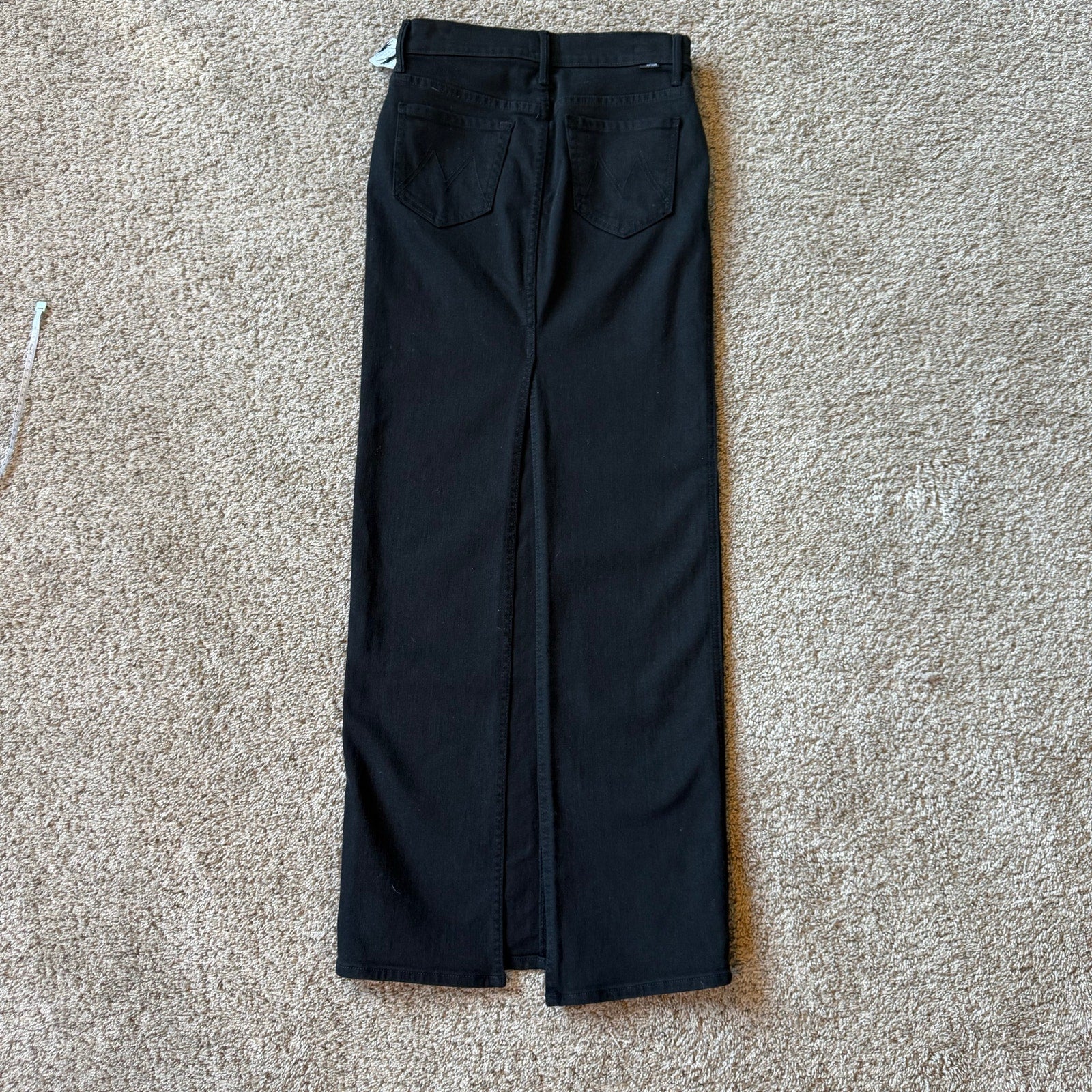 The Flagpole pencil skirt from Mother in black denim, offered new without tags. Crafted from a blend of 68% cotton, 18.5% recycled polyester, 12% reused cotton, and 1.5% elastane. Measurements when laid flat: waist 13.5”, length 41”.