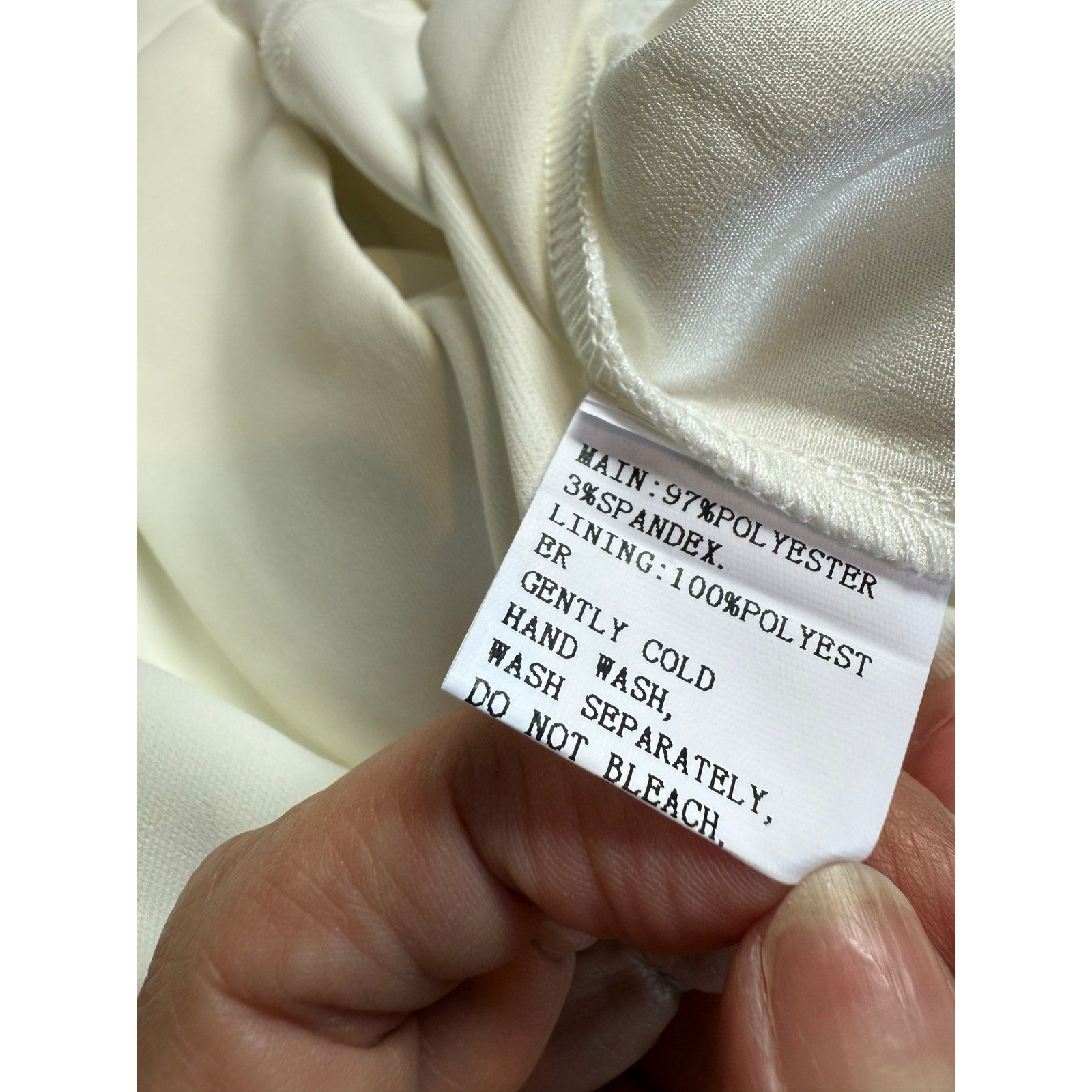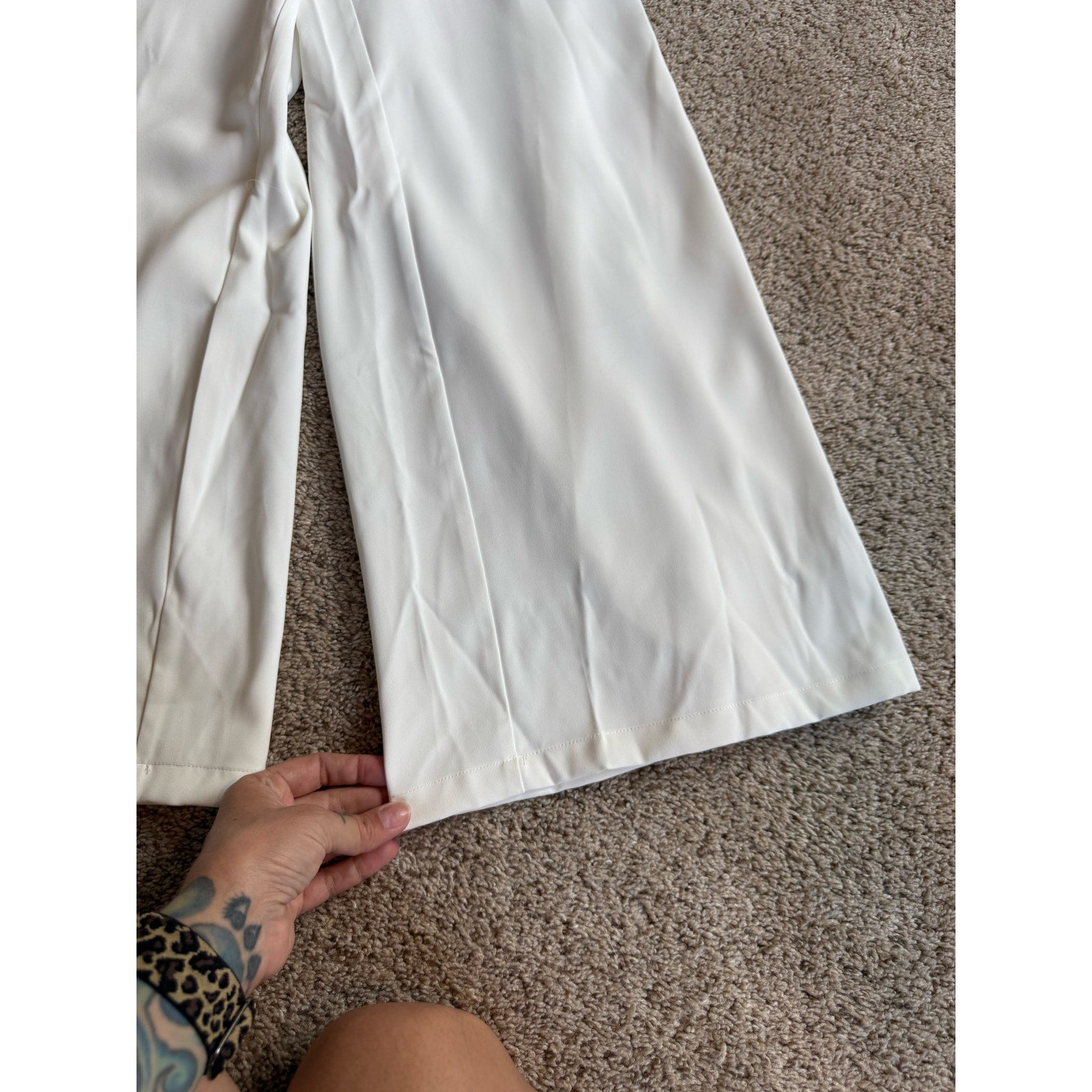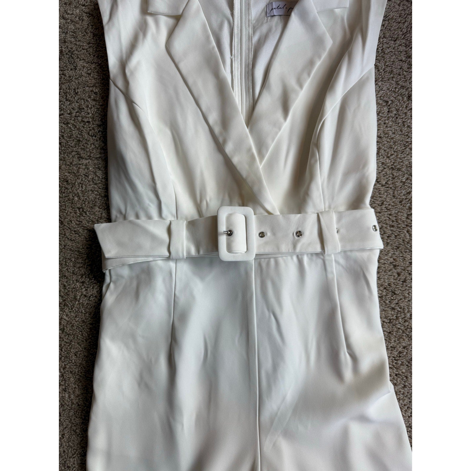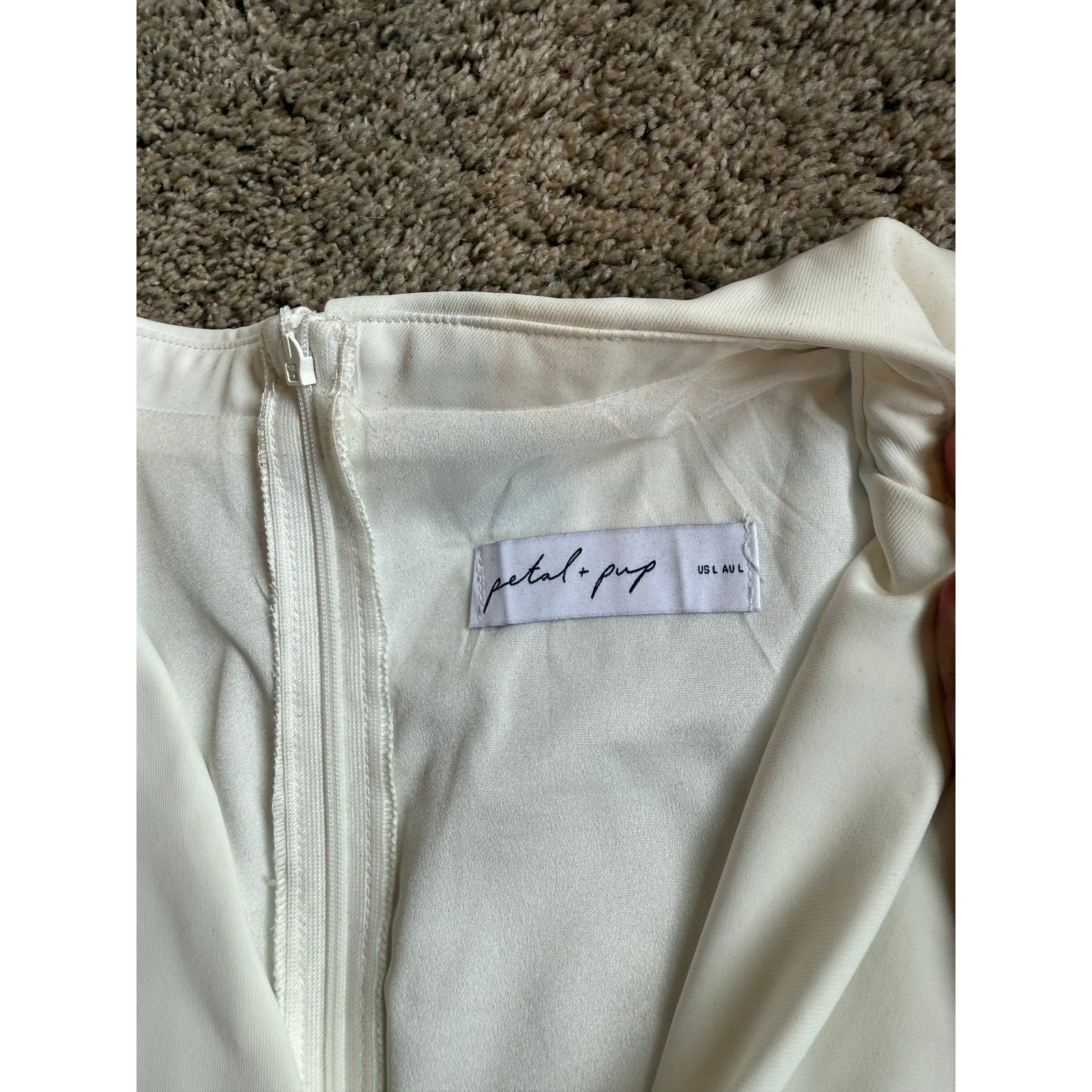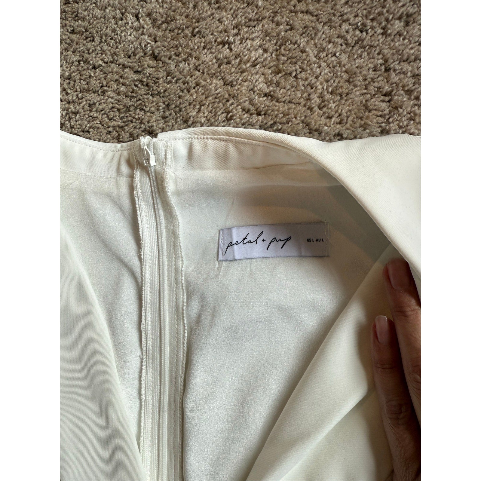 The Petal & Pup belted jumpsuit in size Large is soooo cute and features a creamy off-white shade with a wide-leg silhouette. This collared piece includes a V-neckline, an invisible back zipper, and practical pockets. It comes with belt loops and a detachable belt with buckle, and is fully lined for comfort. Crafted from 97% polyester and 3% spandex, this jumpsuit is an elegant choice for brides, bridal events, weddings, bachelorette parties, and rehearsal dinners. NWOT