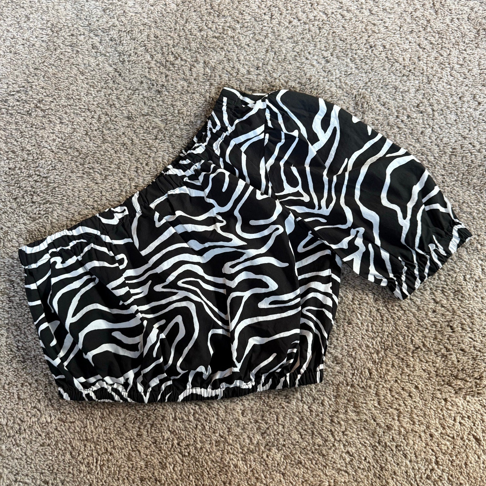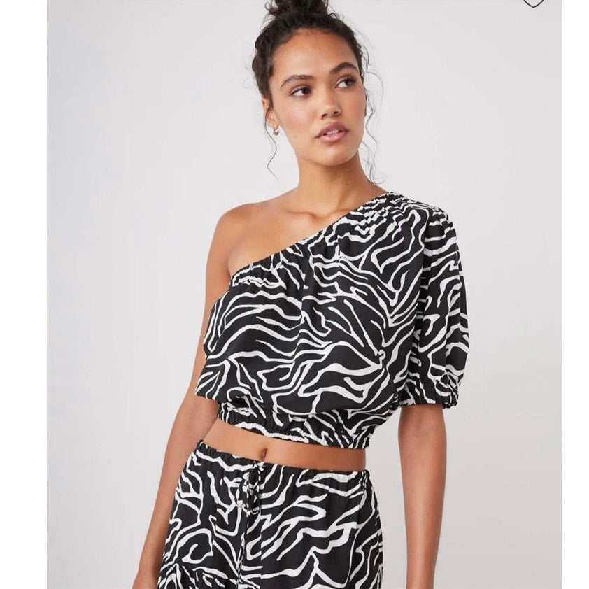 The Evy Top, designed in a swirly animal print, is elegant and playful with a one-shoulder style that shows the perfect amount of décolletage. Elastic at the waist and sleeve gives a sense of security, while crisp cotton poplin is soft on skin with a structured shape.