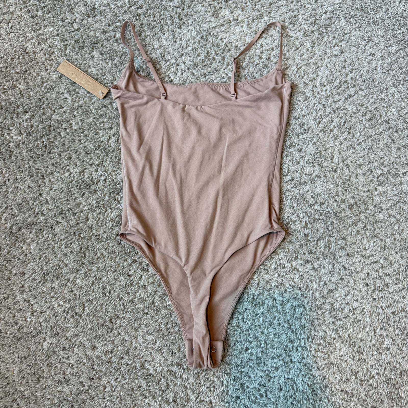 Brand new with tags, the SKIMS Fits Everybody Thong Bodysuit in size XS and Sienna color offers a sleek foundation layer with a retail price of $60. Designed with a wide scoop neckline and low back, it provides an ideal base beneath clothing. The bodysuit features fully adjustable straps, a double-layered fabric construction, high-cut leg openings, and a thong back to ensure it remains discreet under apparel. Made from 76% polyamide and 24% elastane, this piece delivers both comfort and fit precision.