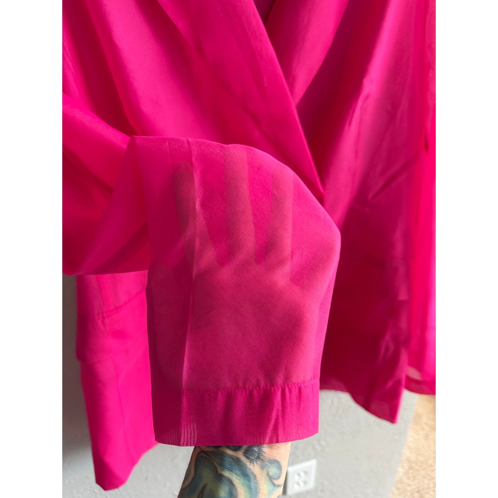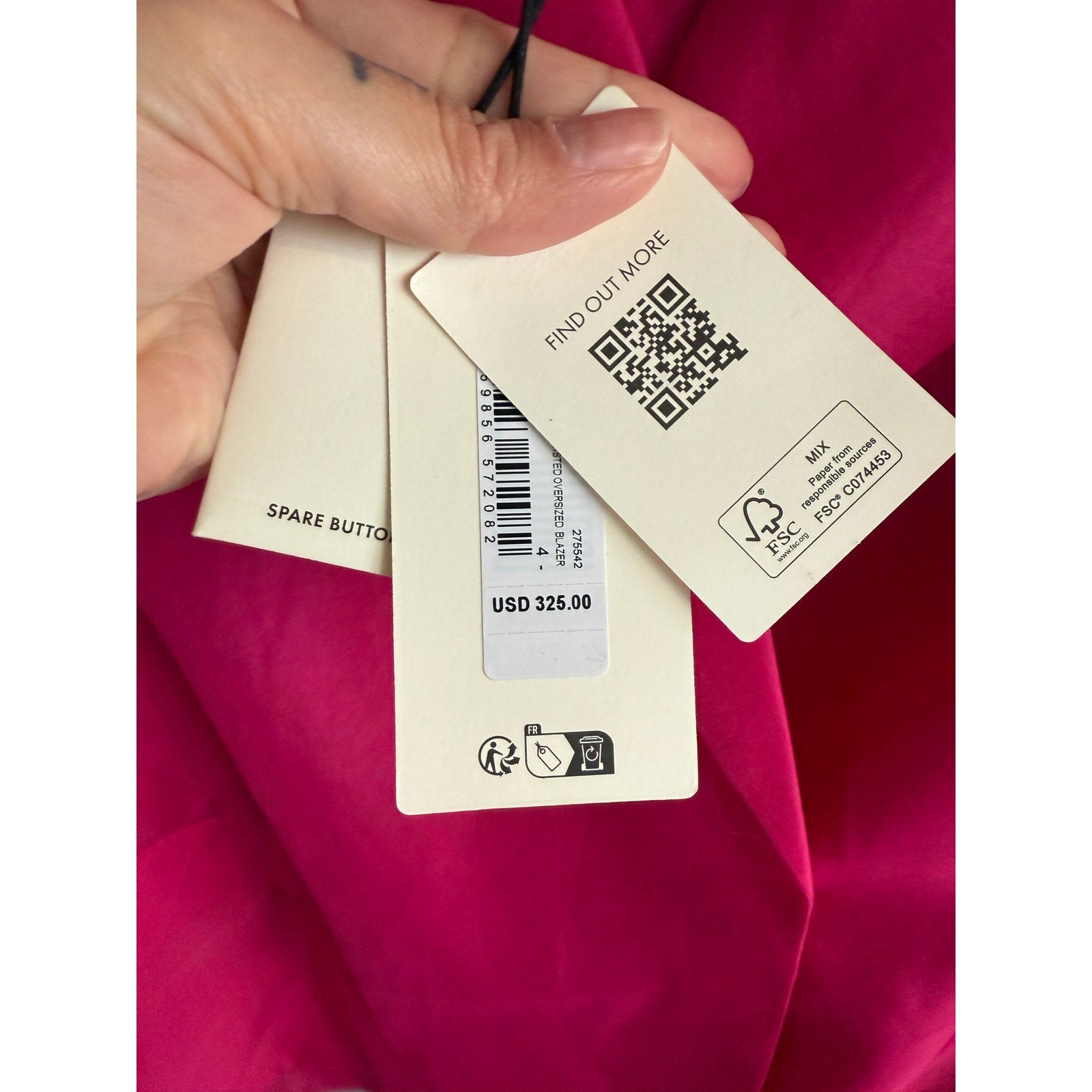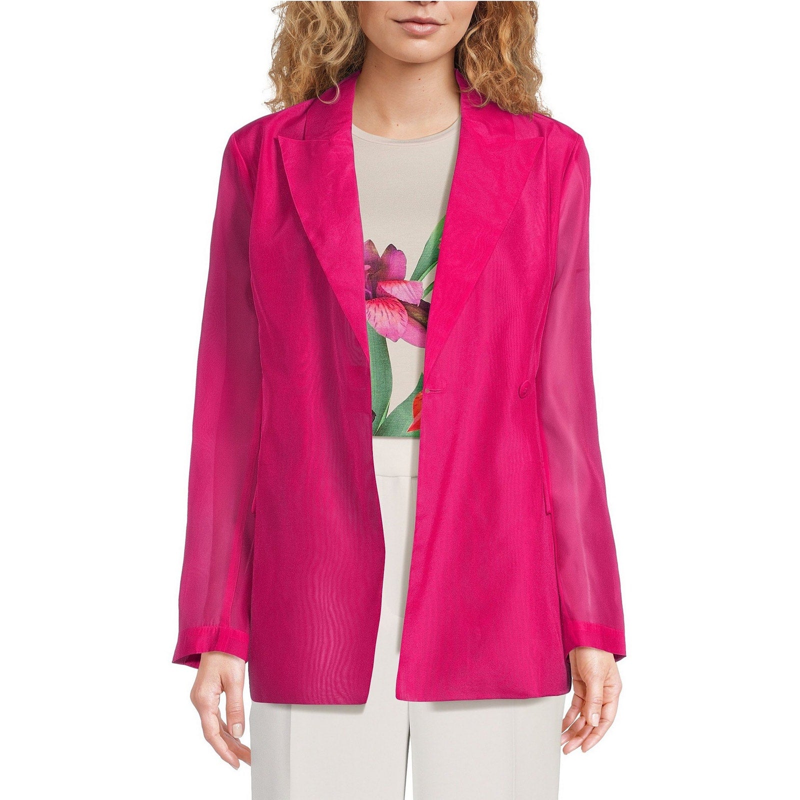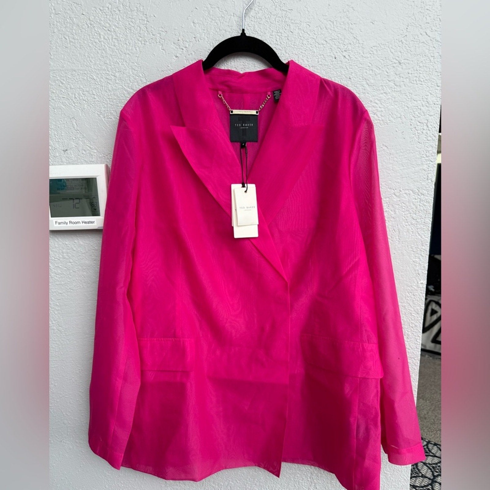 Brand new with tags, this size 4 Ted Baker oversized blazer in pink is crafted from organza and features sheer sleeves that offer greater transparency than the bodice. Originally retailing for $325, it combines contemporary design with a delicate, airy feel.