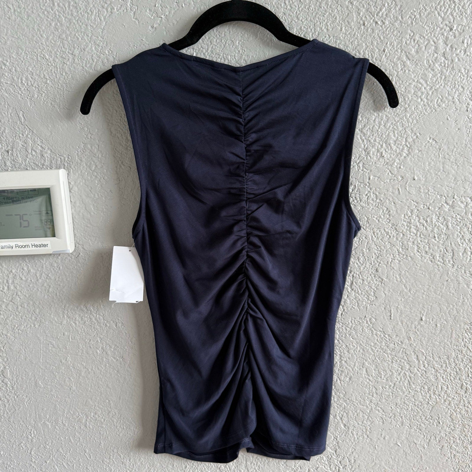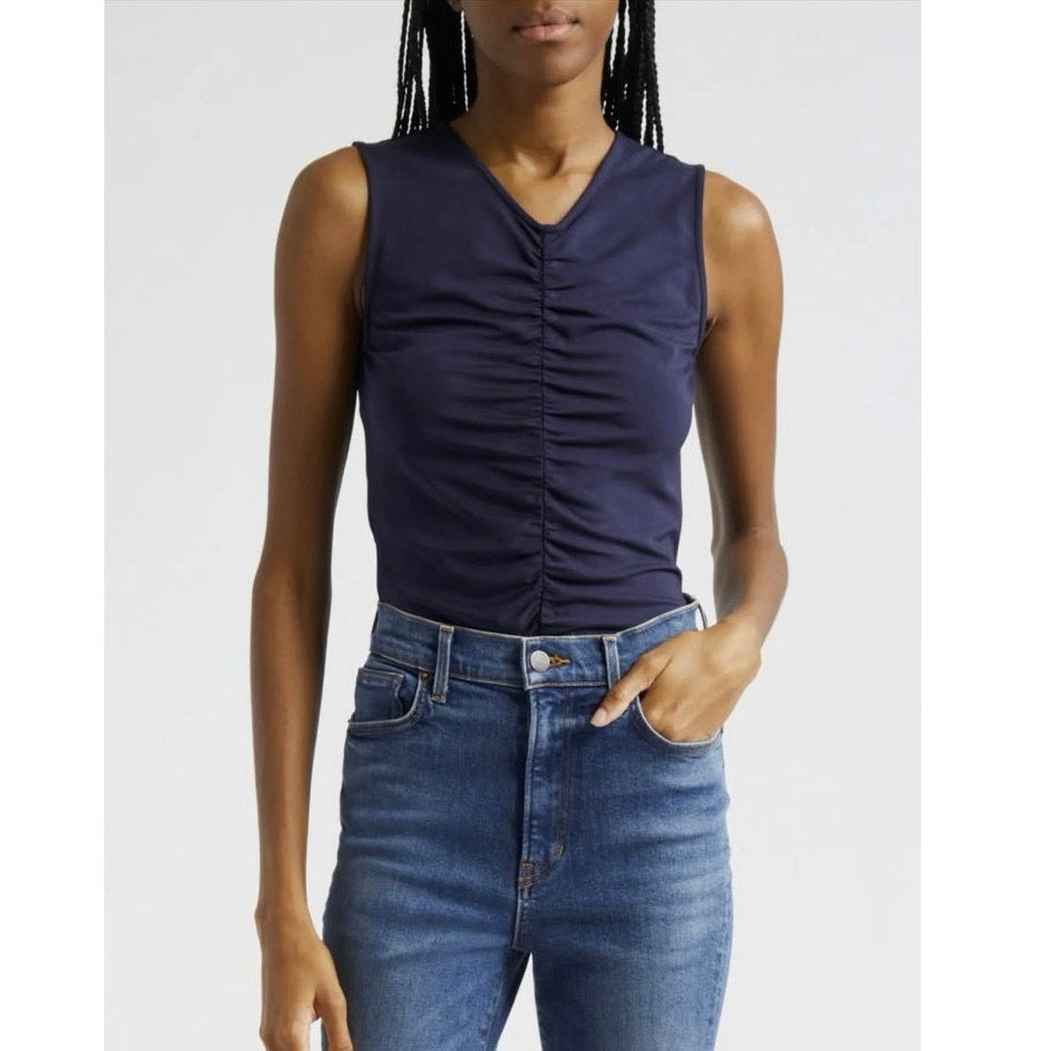 The Veronica Beard "Neeta" stretch-knit tank features a central ruching detail and a deep V-neckline for a flattering fit. This sleeveless, form-fitting top extends to the hip and is designed for easy pullover wear. Crafted from a lyocell and elastane blend, it combines comfort with style. Imported. NWOT - MSRP $198.