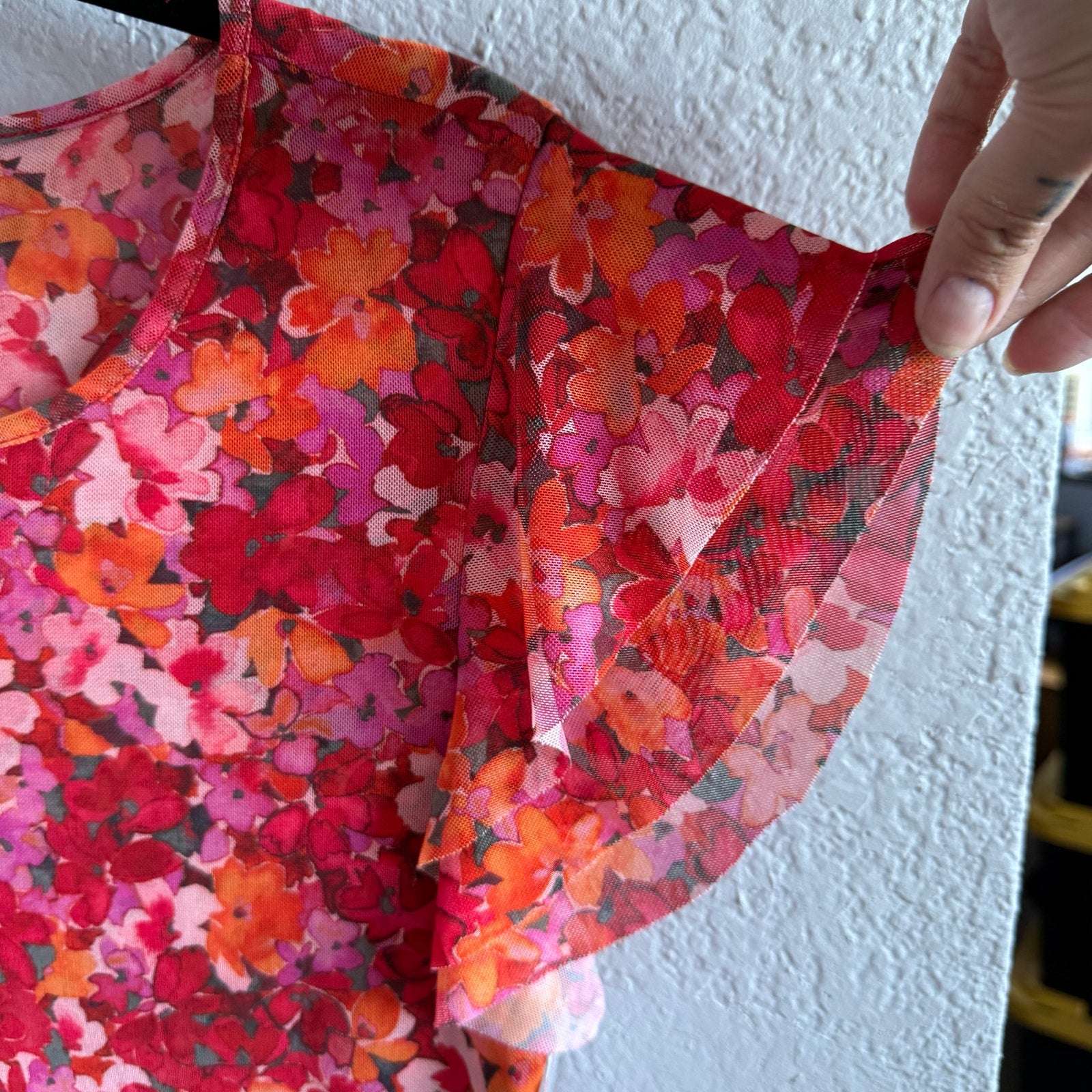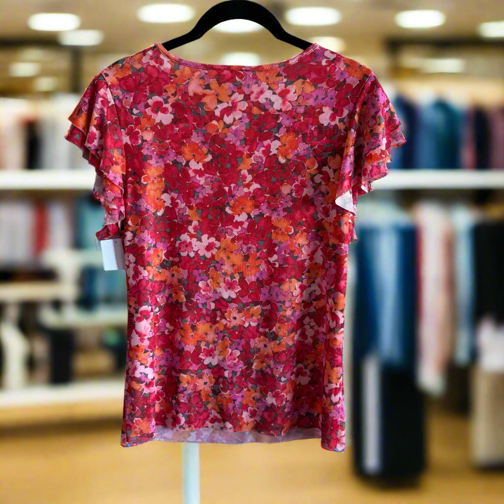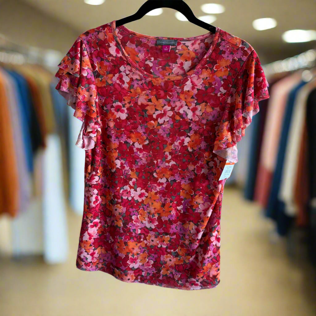 Lightweight and stretchy Vince Camuto floral top with a ruffle short sleeve